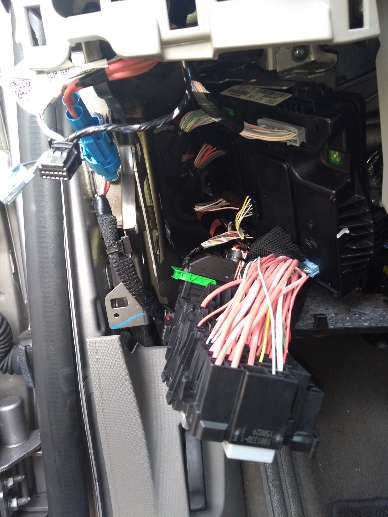 Dann die vordere Verkleidung nehmen, die 3 Stecker dran, dann erst oben unter das Armaturenbrett einsetzen, dann unteren Bereich einsenken und links hinter das untere Fußraumverkleidungsplastik legen, rechts einrasten, links die zwei Schrauben wieder rein drehen. Seitenverkleidung einsetzen (aufpassen, eine der vorderen Nasen liebt es sich zu verbiegen) und Türgummi rein, fertich.