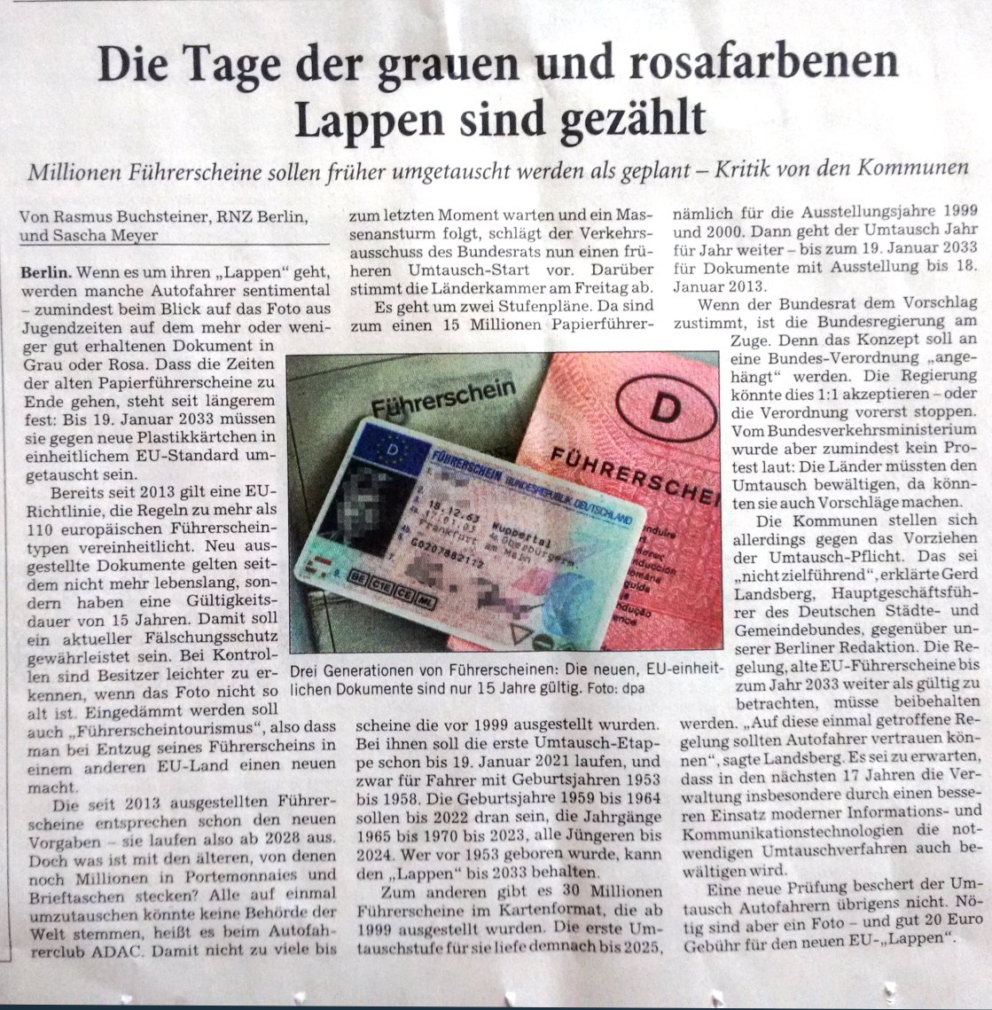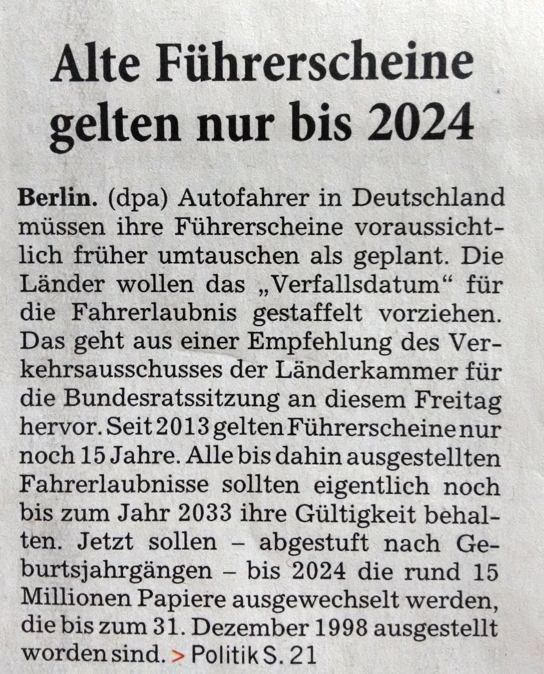 Ich hatte das schon wieder aus dem Kopf verbannt, zuletzt 2016 stand es in der Zeitung, dass ja die alten Lappen - obwohl als unbegrenzt gültig ausgestellt - ab spätestens 2033 ungültig werden sollen.