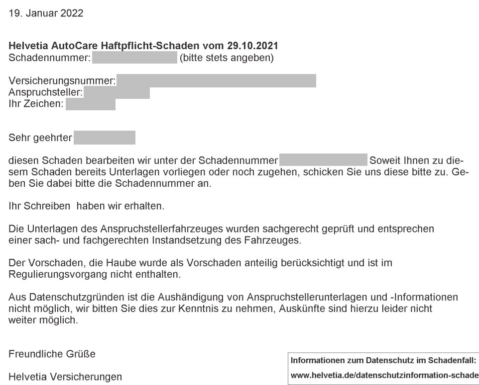 "Ich bedauere Ihnen mitteilen zu müssen, dass ich aufgrund dieser Regulierungsart, die jedem Betrug alle Tore öffnet, die Versicherungsverträge nicht länger bei Ihrem Unternehmen aufrecht halten kann. Mit Verkauf des (T3) werde ich dem Käufer davon abraten müssen, das Fahrzeug bei Ihnen zu versichern.