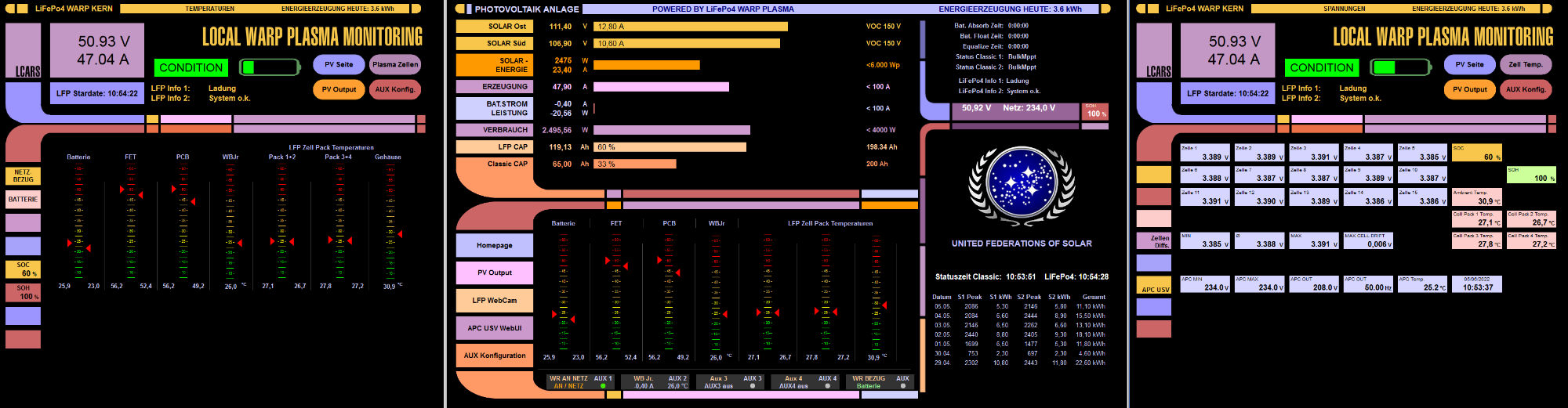 Habe noch mal eine eigene Seite für die Temperaturen gemacht und die Hauptseite entschlackt (da ich ja die Zellendetails auf ner zweiten Seite habe), macht das angenehmer für's Auge und schaut "originaler" aus