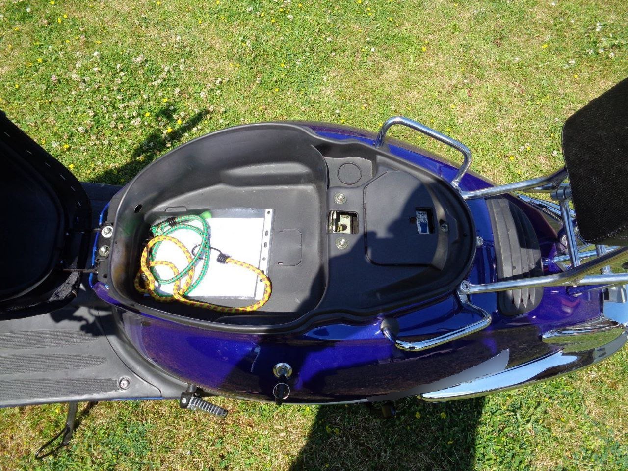 Unter der Sitzbank ist beim Verbrenner-Pendant dann Platz für den Helm. Hier sitzt einer der fünf Bleiklötze, die anderen vier Klötze sind in einer Blechschachtel unter dem Trittbrett verbaut.