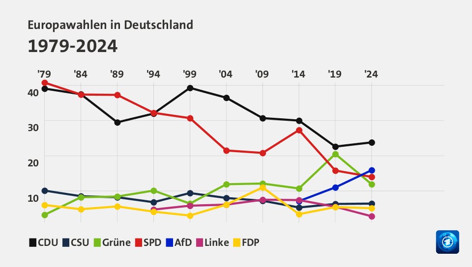 Mit dem „der Zug scheint endgültig abgefahren zu sein“ passt allerdings nicht auf die Grünen. Wenn man sich den Verlauf der Europawahlen anschaut, dann haben diese in 2019 einfach aufgrund der damaligen Klimapolitik ein ungewöhnliches Hoch gehabt und sind jetzt wieder auf dem Niveau der Wahlen in den Vorjahren.