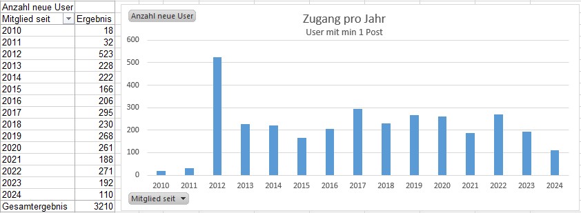 Da gibt es einen starken Peek natürlich im Jahr 2012, danach tatsächlich so rund 200 neue User pro Jahr, mal mehr, mal etwas weniger.