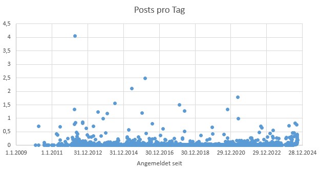 Ein einsamer Spitzenreiter mit im Durchschnitt 4,1 Beiträge jeden Tag seit der Anmeldung fällt auf, aber auch viele neue User, die spätestens nach zwei Tagen einen neuen Beitrag verfassen.