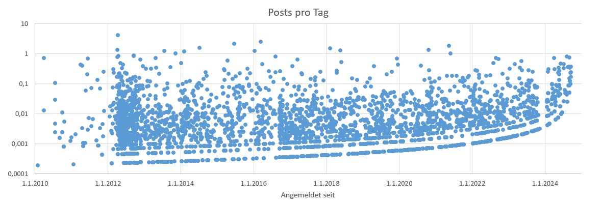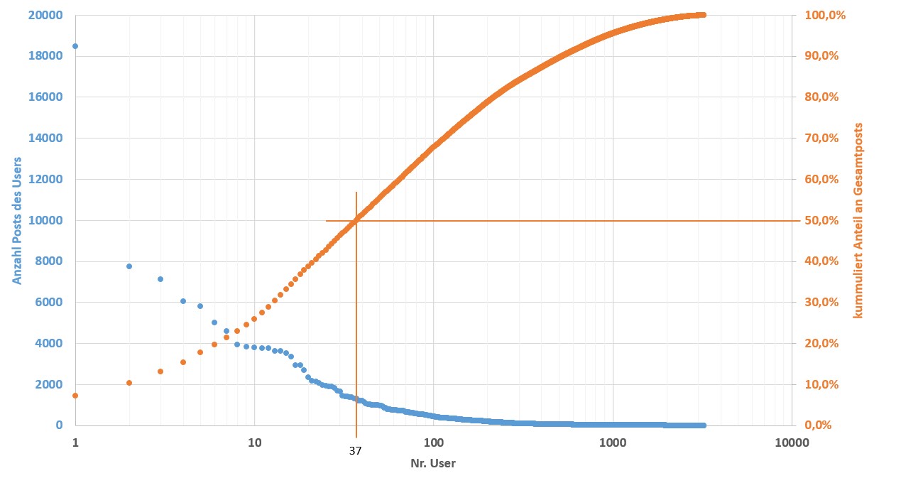 Die unten im Diagramm erkennbaren drei Punktelinien sind übrigens die User mit nur 1, 2 oder 3 Beiträgen.