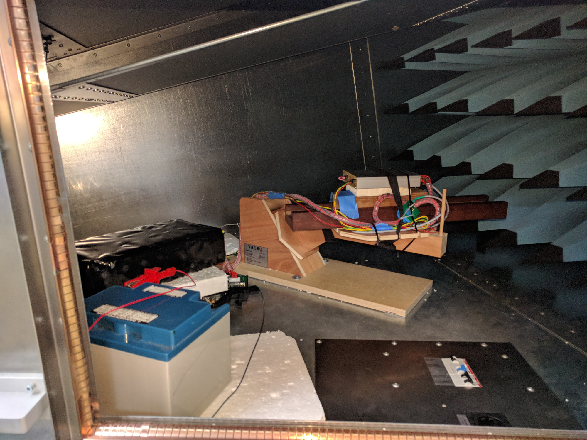 Hier ist der Aufbau in der Messkammer mit 16S LiFePo4 Akku und 12V Akku. Der CANBus wurde von außen über einen IXXAT USB CAN Adapter angesprochen.