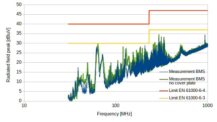 Das BMS erfüllt die allgemeine EMV Norm hinsichtlich Abstrahlung sowohl für Industrie als auch Heimgebrauch.