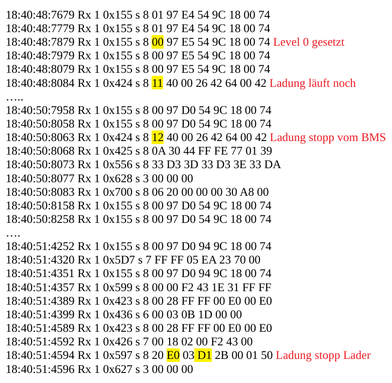 dexter schrieb: Hm, ich sehe nicht… E4/D1 ist normal für den Stop, der Lader ist da nicht beleidigt. Schau nochmal in mein Protokoll-Spreadsheet, in die Blätter "Protocol" und "End-Chg".