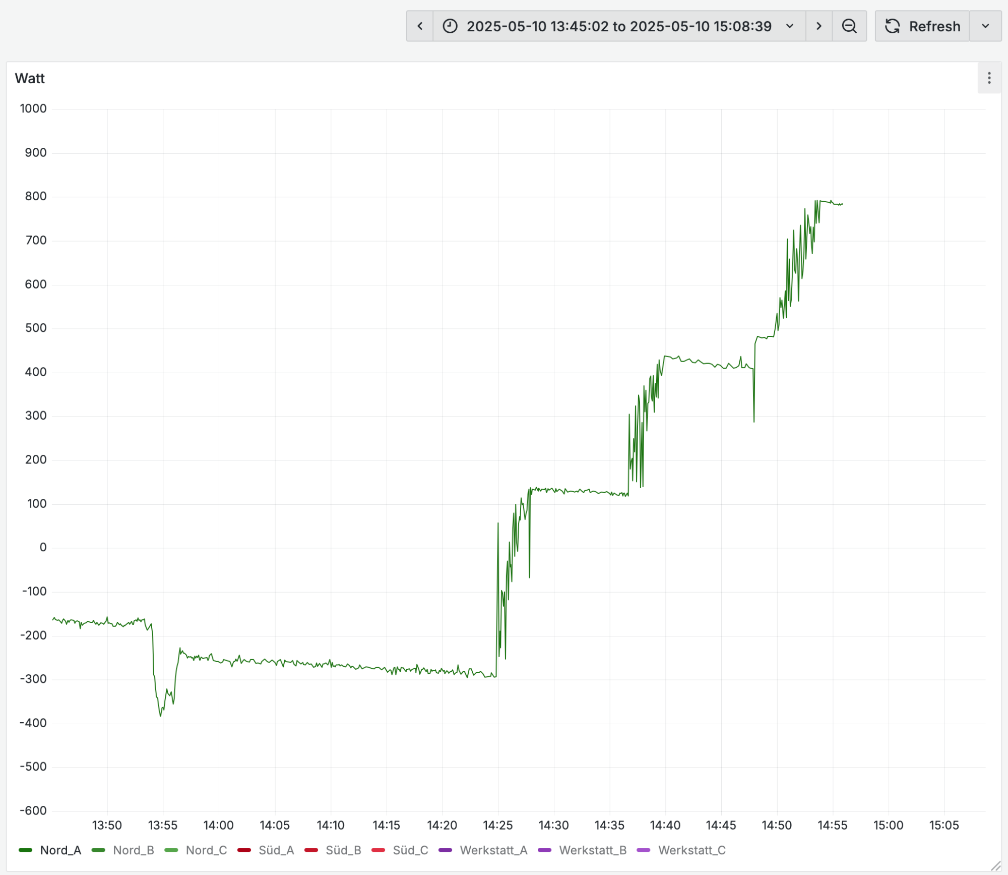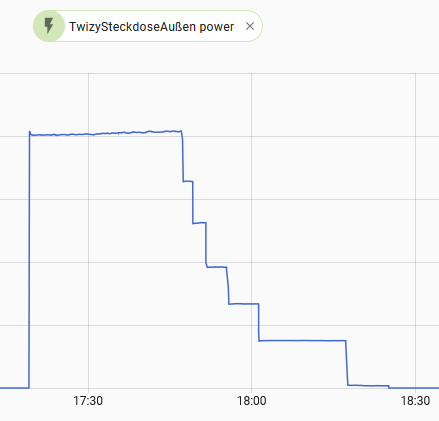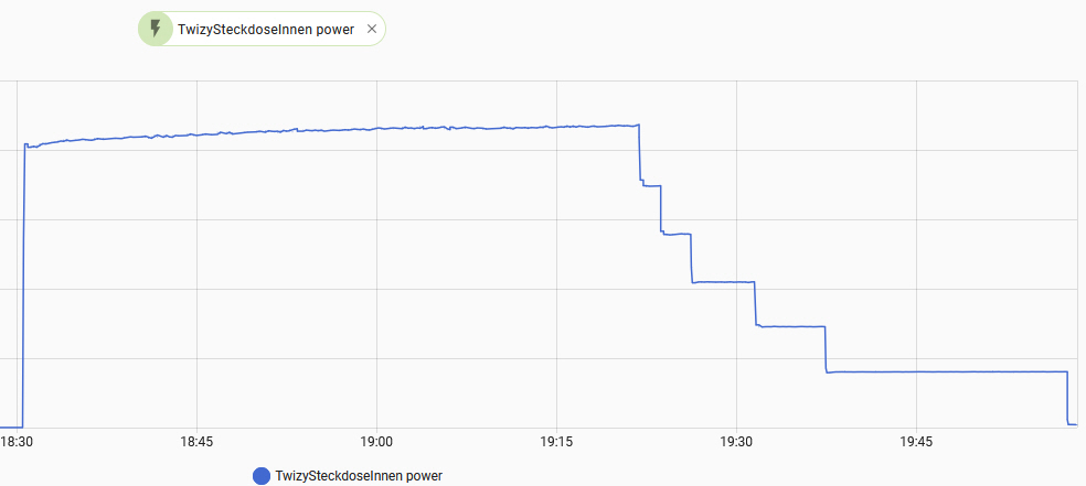 Die Stufen beim Runterregeln der Ladeleistung sind auch mit diversen anderen Verbraucher und Balkonkraftwerk an der Phase deutlich sichtbar.