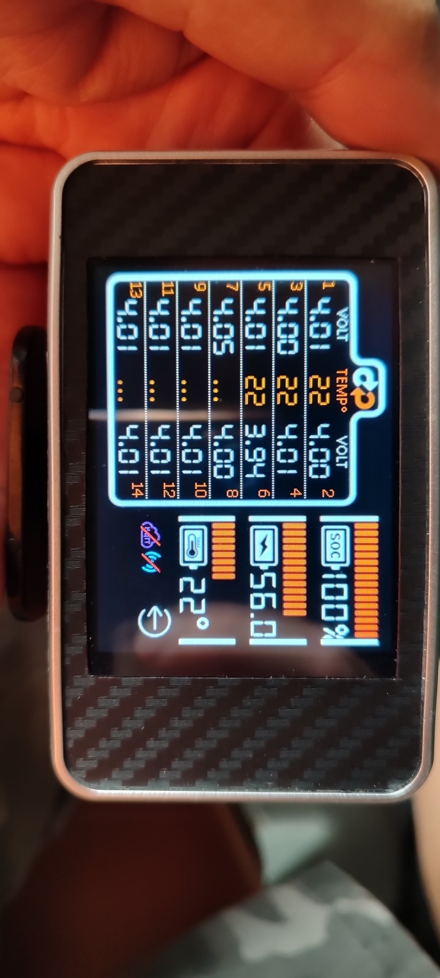 (Ich weiß, dass es bei mir bei Zelle 1 vermutlich ein zu dünnes Kabel ist, daher schwankt bei mir die Spannung dahingehend. Ich hab zur "lösung" jetzt Vmin und Vmax erhöht. Dementsprechend zeigt er mir zwar nicht mehr den richtigen SOC an, dafür kann ich aber fahren. (Auf kurz oder lang werde ich aber das Kabel im Akku dann tauschen.