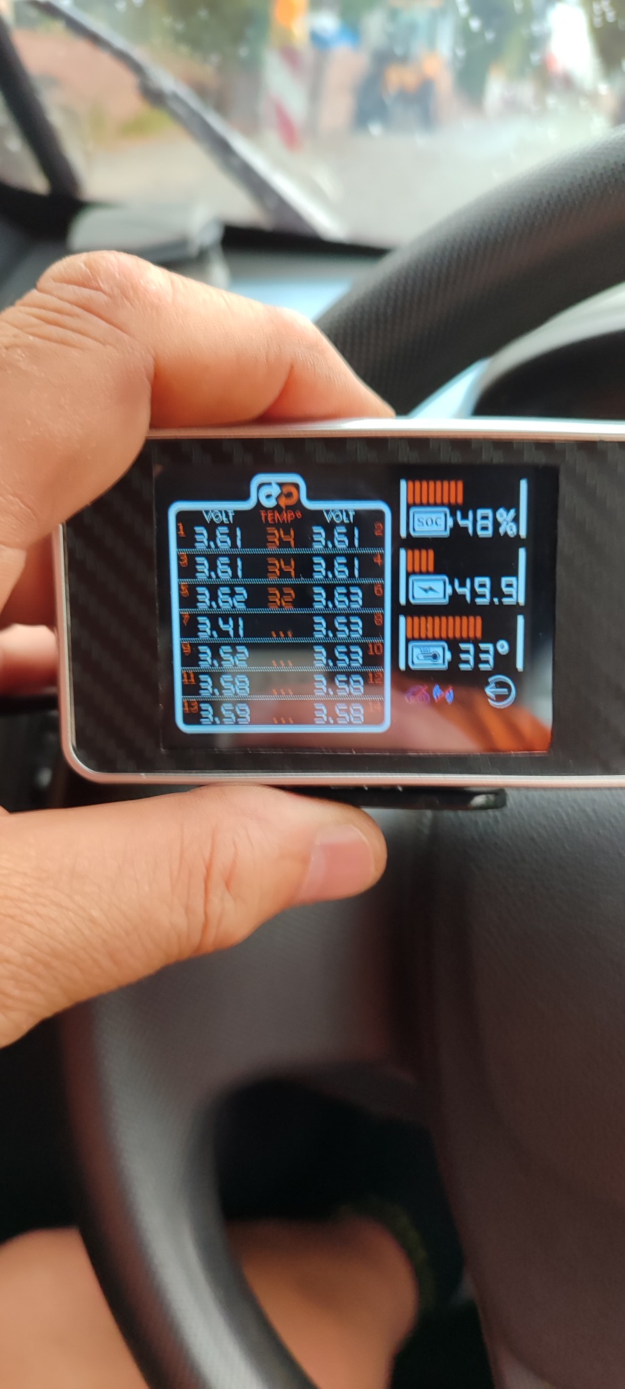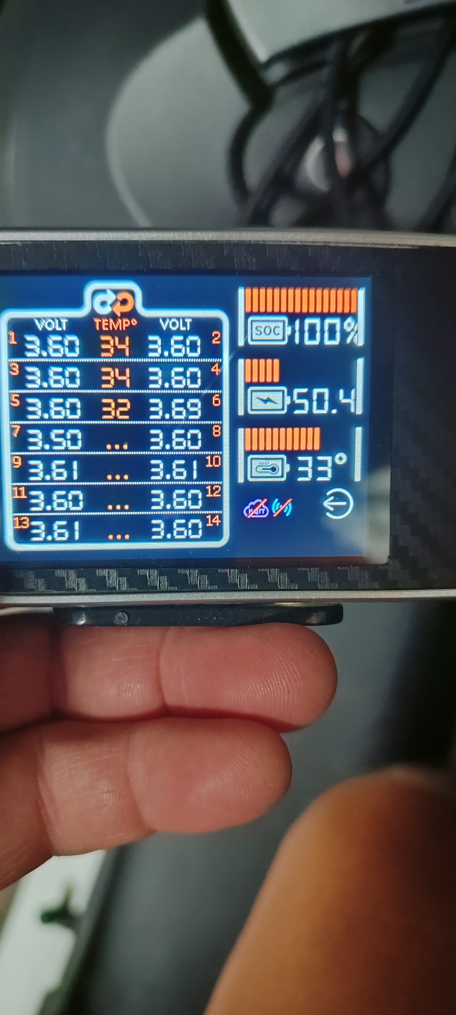 (Ich weiß, dass es bei mir bei Zelle 1 vermutlich ein zu dünnes Kabel ist, daher schwankt bei mir die Spannung dahingehend. Ich hab zur "lösung" jetzt Vmin und Vmax erhöht. Dementsprechend zeigt er mir zwar nicht mehr den richtigen SOC an, dafür kann ich aber fahren. (Auf kurz oder lang werde ich aber das Kabel im Akku dann tauschen.