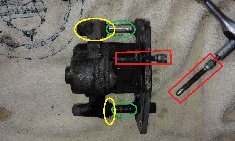 Die mit der roten Markierung. Diese Schrauben führen unsere Beläge und wenn es da klemmt ist die Bremse auch schnell hin.