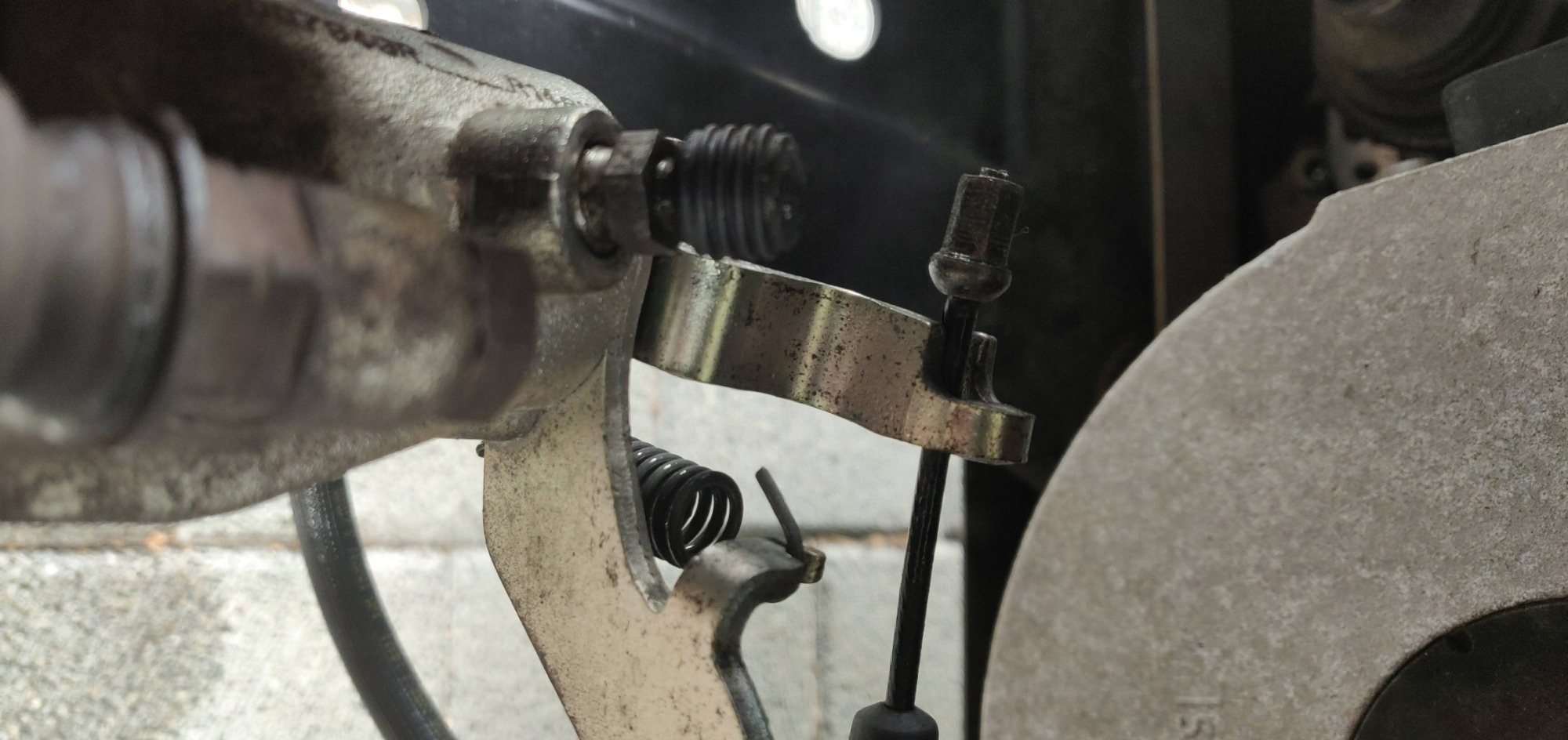 2. Die Handbremse löst sich nicht mehr. Das Foto zeigt das Handbremsseil im komplett gelösten Zustand.
