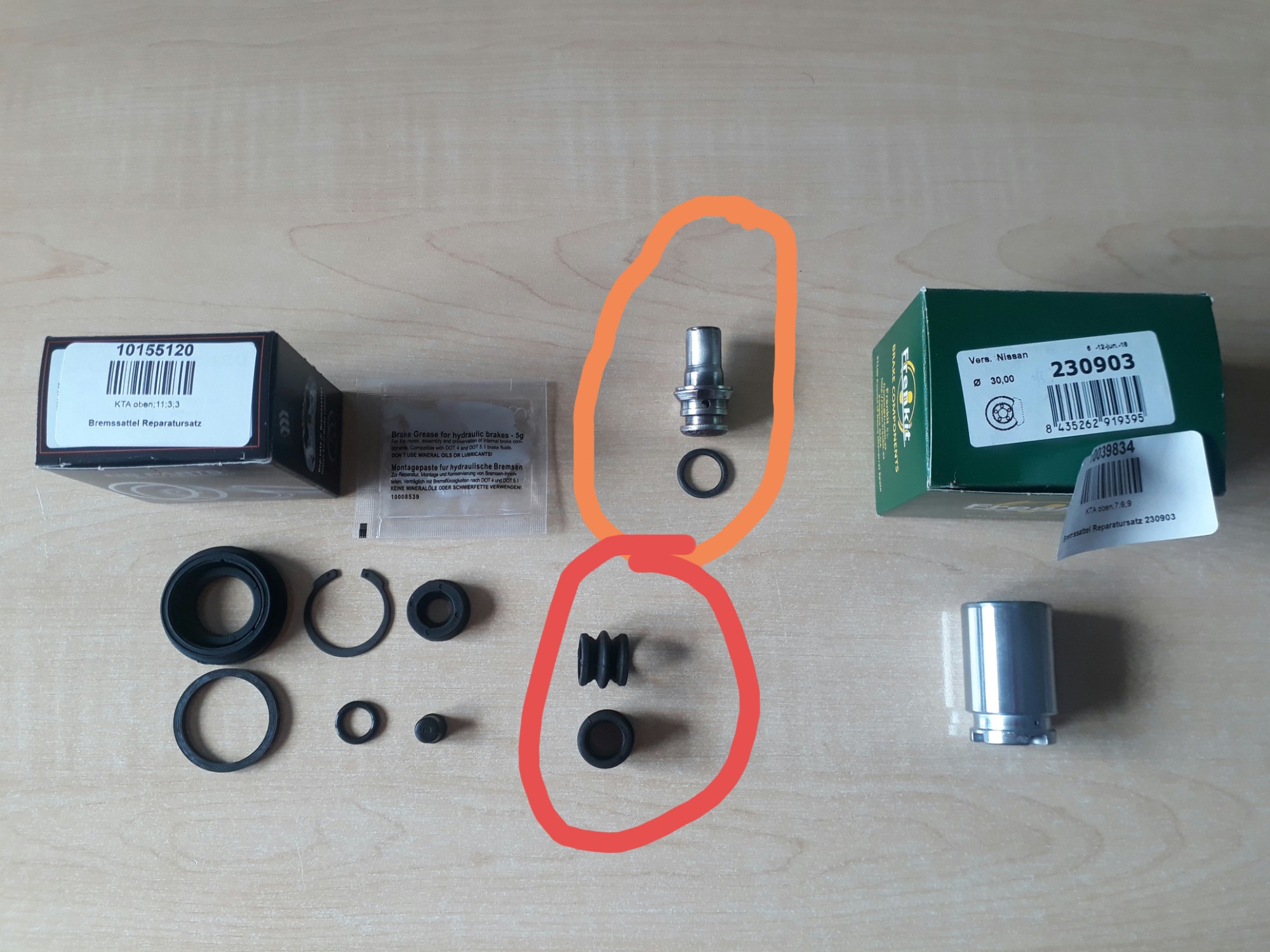Leider habe ich keinen Bremssattel hier rumliegen um zu prüfen ob alles passt, aber hier ist ein Foto von den gelieferten Teilen.