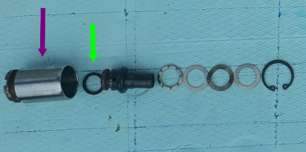 Links, wo die Dichtung sitzt, gammelt der drehende Teil am Kolben fest und deswegen funktioniert die Selbstnachstellung nicht mehr.