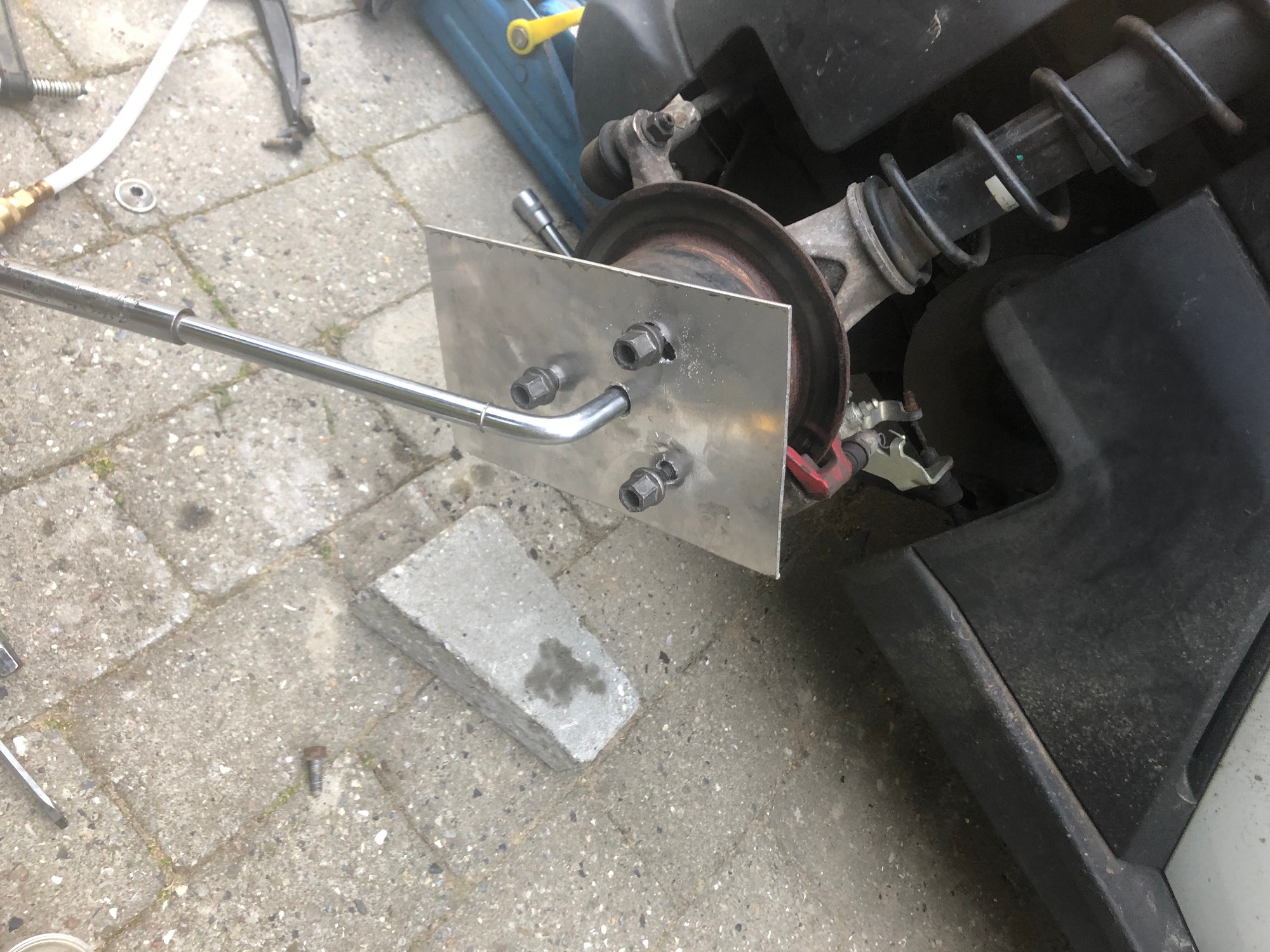 Auf der rechten Seite war der Nabenmutter vollkommen festgerostet und selbst mit meinen Schlagschrauber (Max Einstellung 570 NM) hatte ich keine Chance den Mutter zu Lösen. Letztendlich habe ich ein kleines "Werkzeug" aus eine 4mm Aluplatte gemacht und damit ist es mir dann gelungen den Mutter zu lösen. Meine Frau hat dabei so fest wie es überhaupt ging auf die Bremse getreten.
