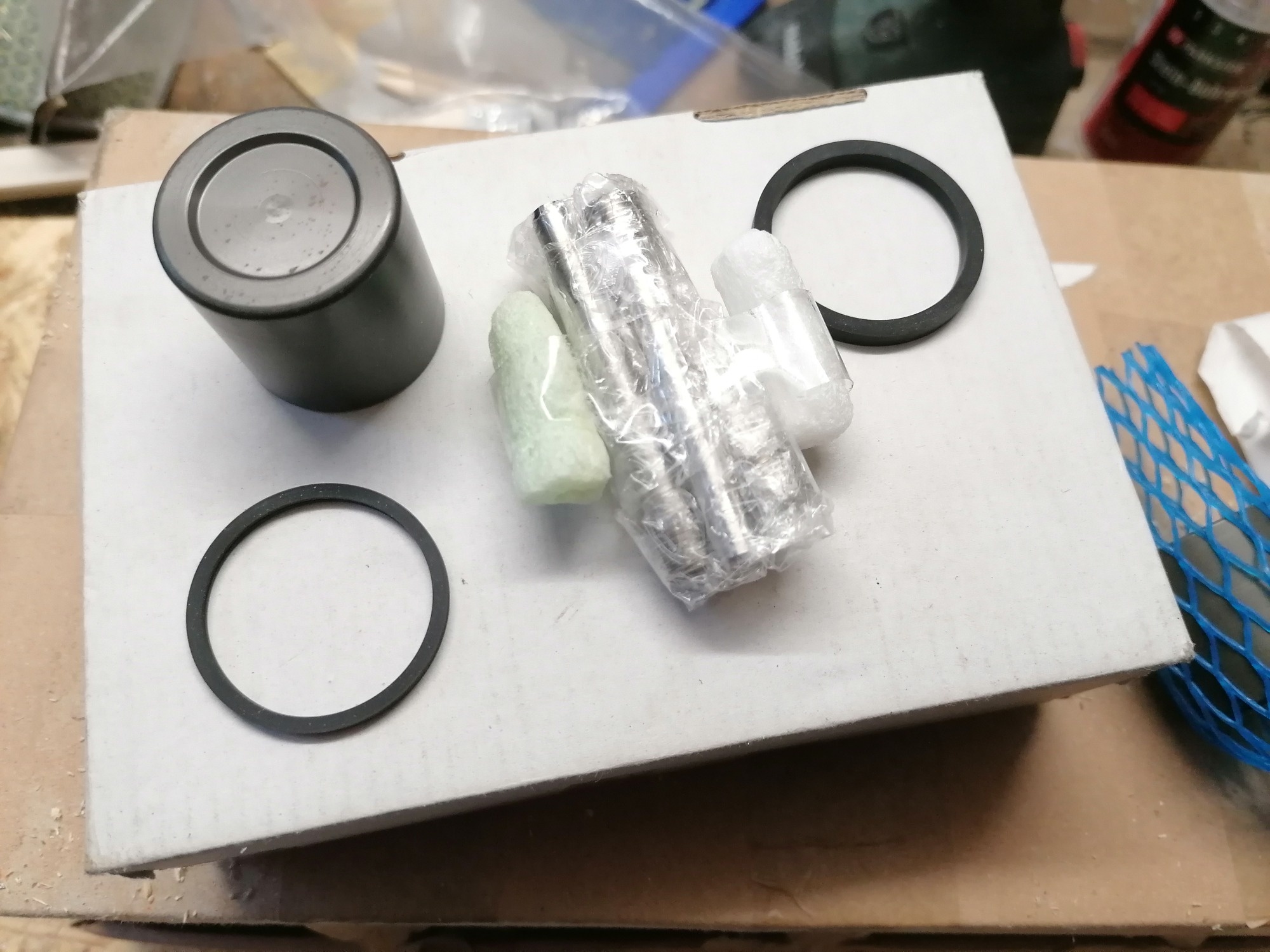 Vor einer Weile habe ich dazu bei Kleinanzeigen einen der Sätze mit neuen Bremskolben, 4 Dichtringen und den 4 Schrauben bekommen.