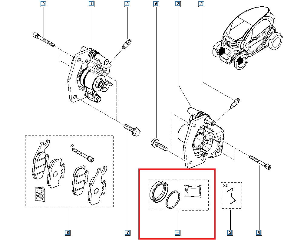 Ich habe mir den Bremssattel vorn jetzt noch nicht en detail angesehen, kenne es aber von meinen Bremssätteln an meinen anderen Fahrzeugen (und auch von der hinteren Bremse am Twizy) so, dass sich am Kolben noch eine Staubschutzmanschette befindet. Diese sieht man auch in Dialogys/Catcar.