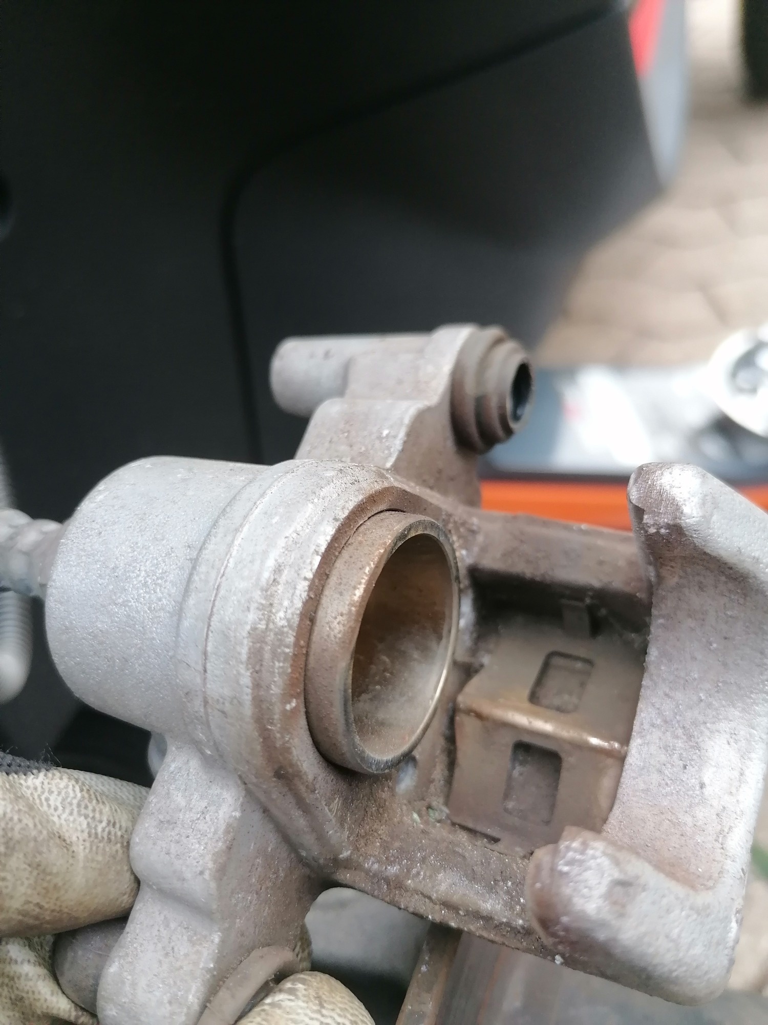 Weil ich auch mehrere BMW-Roller habe, durfte ich dort auch schon hintere Bremssättel wechseln. Am 200er hat man die gleichen Bremssättel, wie am 125er. Am 125er halten sie ewig, aber am 200er sind sie nach 30.000 km total ausgeschlagen, weil der stärkere Motor wegen des anderen Hubs viel rauer läuft. Bei der verbesserten Version mit geschraubtem, statt geklemmtem Haltestift, wird der Stift beim Vibrieren des Motors angenäht, Bus er durch ist und wenn man nicht ständig kontrolliert, kann es passieren, dass man unterwegs die Bremsklötze verliert.