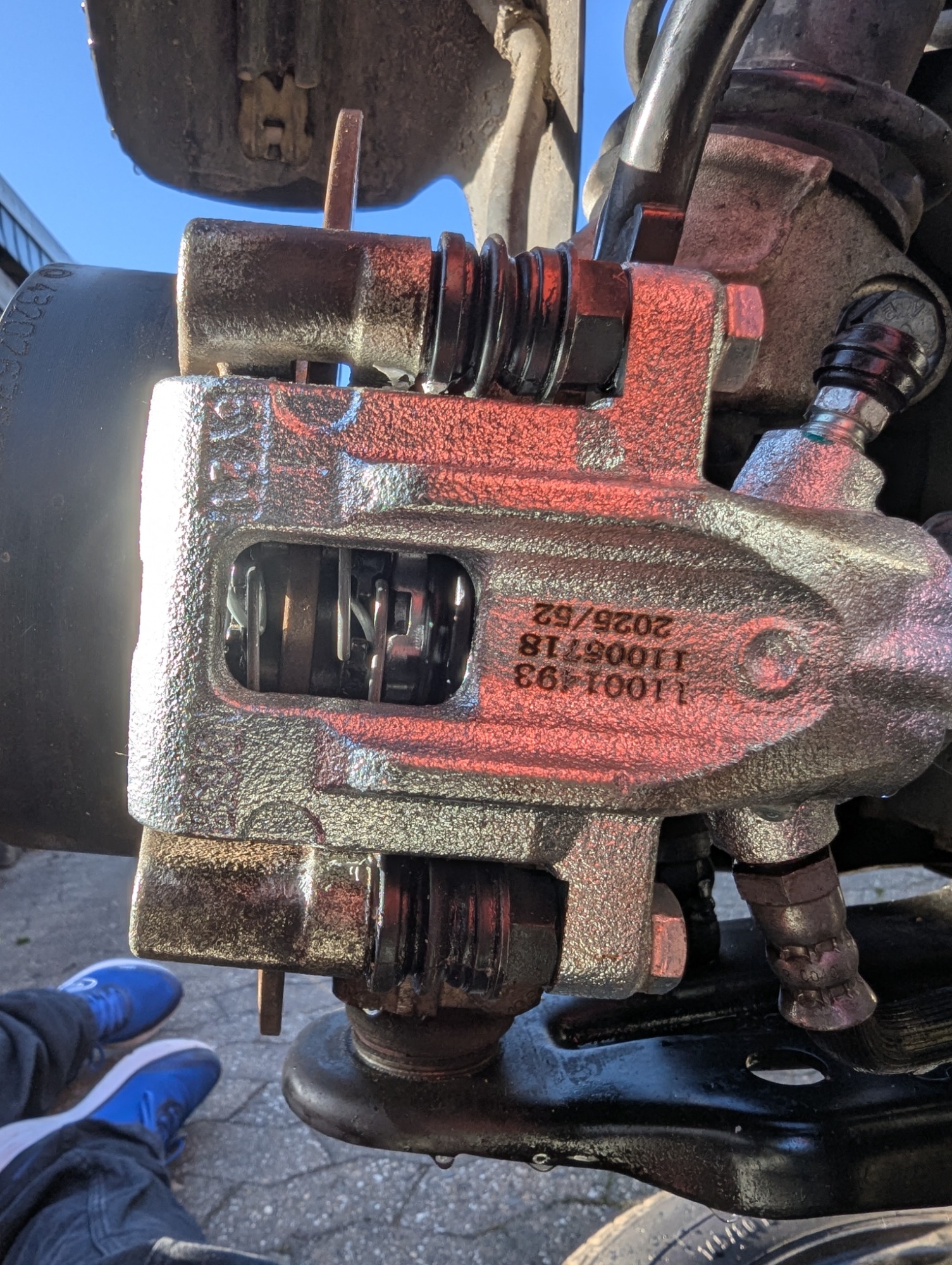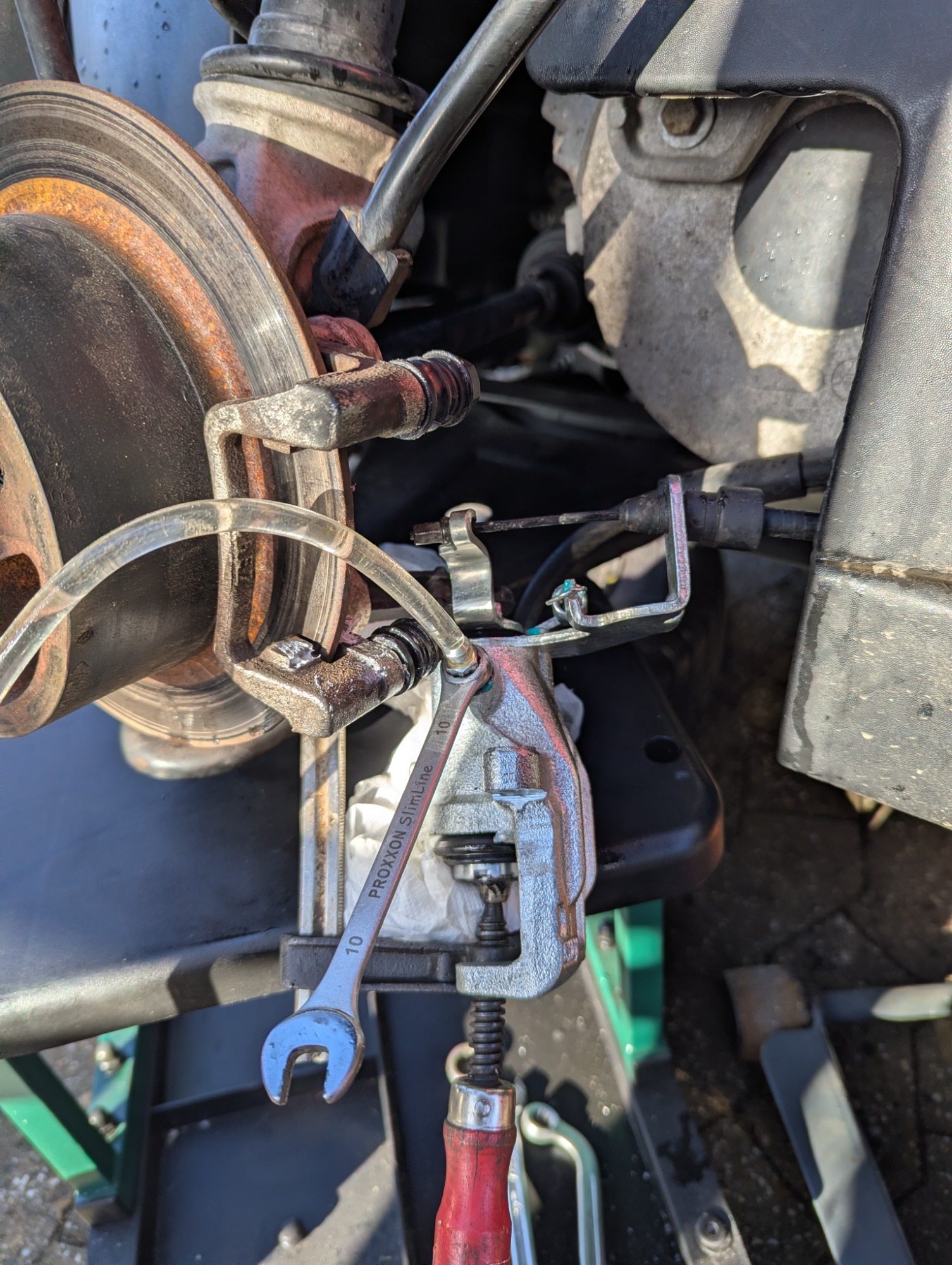 Heute bin ich dann nochmal in den kompletten MacGyver-Modus gegangen und habe den Sattel am Belagträger demontiert und das ganze Prozedere nochmal wiederholt, dabei aber den Sattel permanent geschüttelt, gedreht, geklopft und so weiter... Dazu habe ich dann immer mal wieder die Handbremse mit einer Zange direkt am Sattel betätigt. Dabei haben sich nochmal ein paar Luftblasen gezeigt.