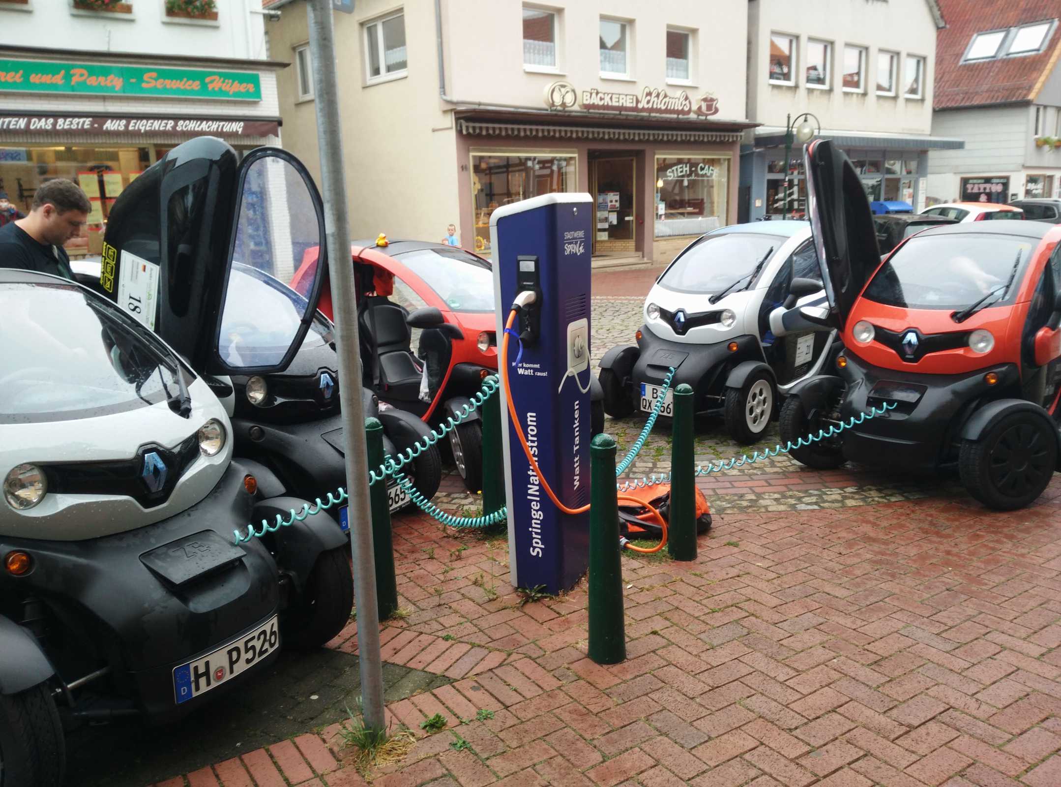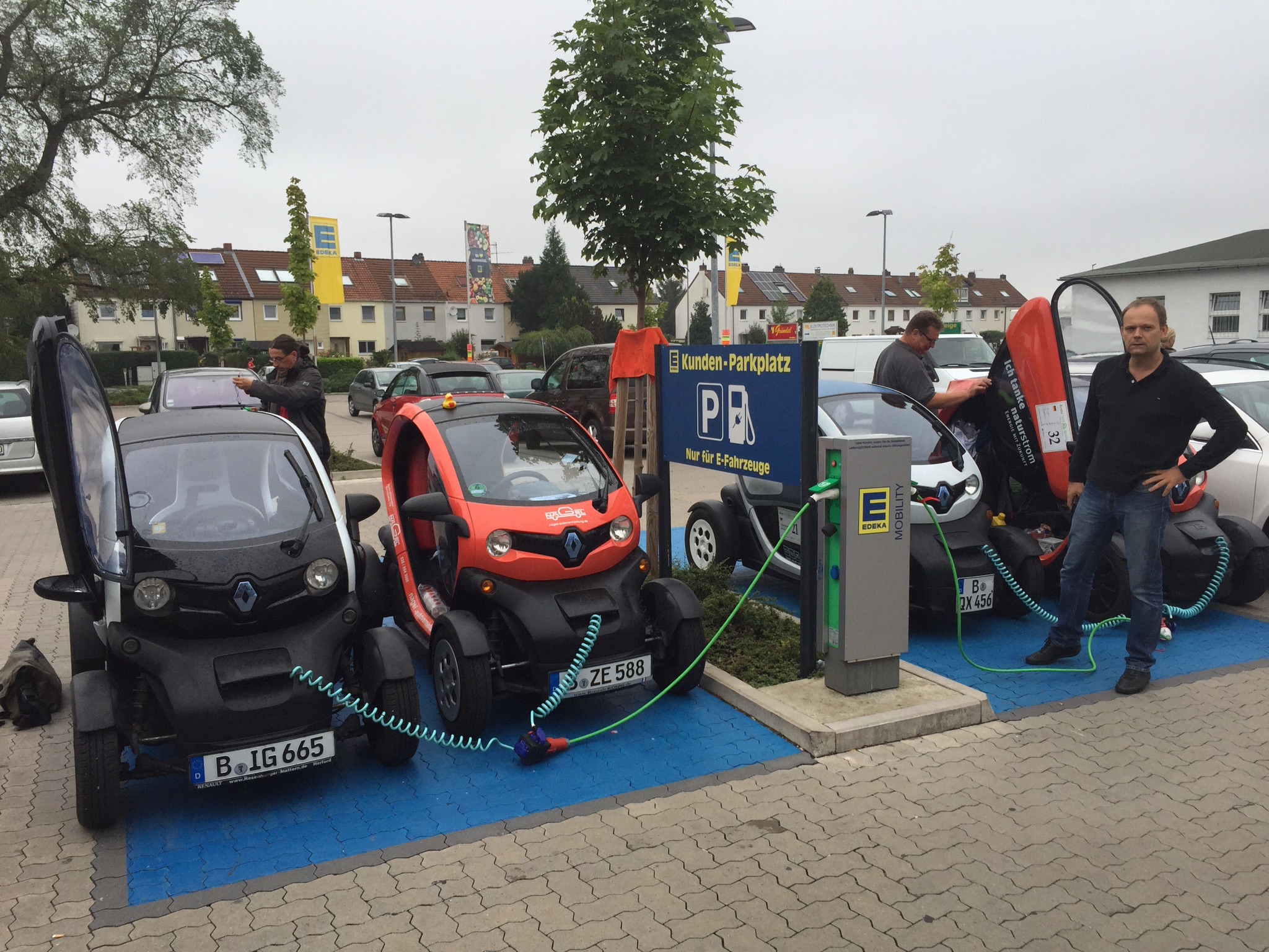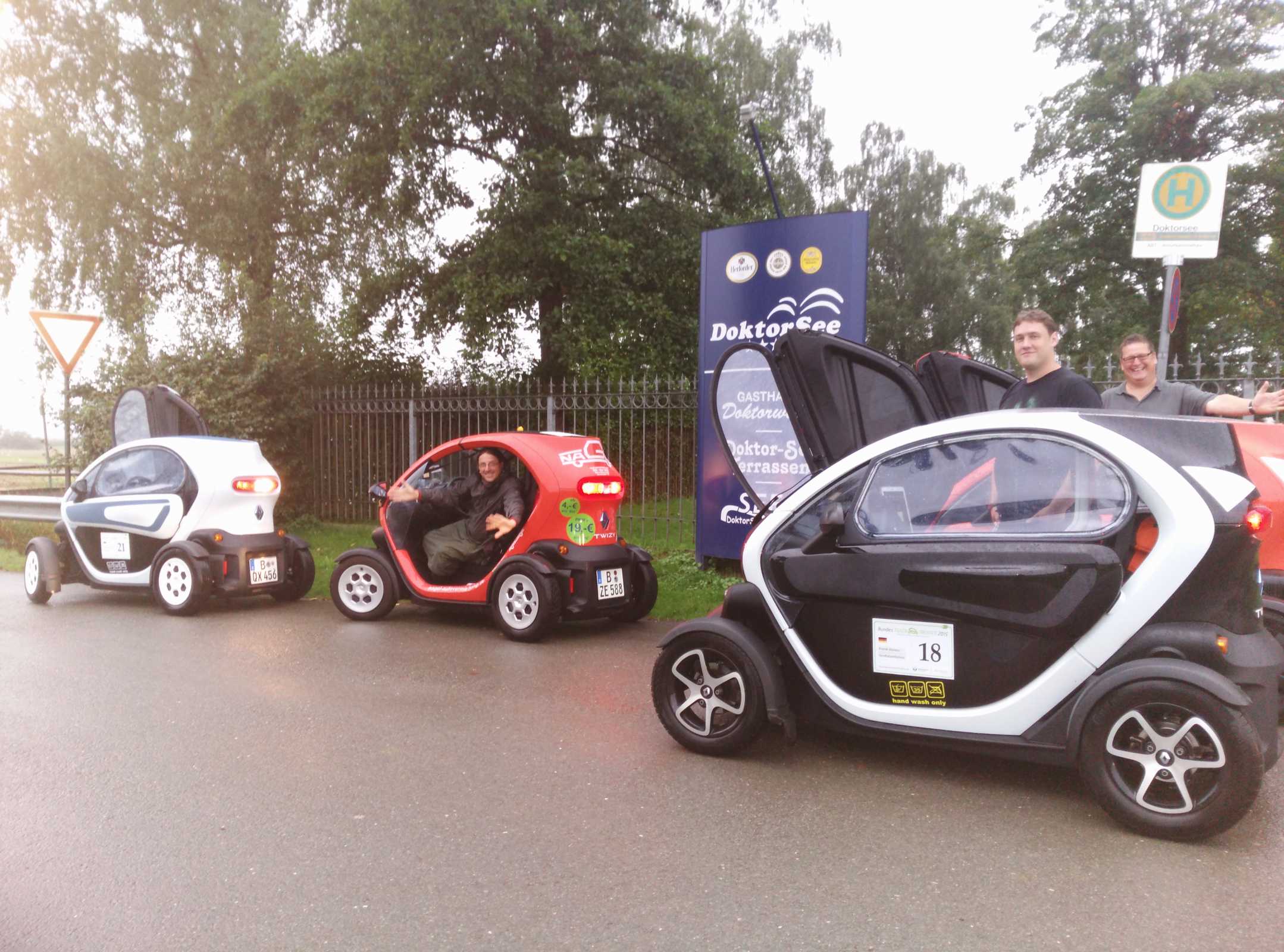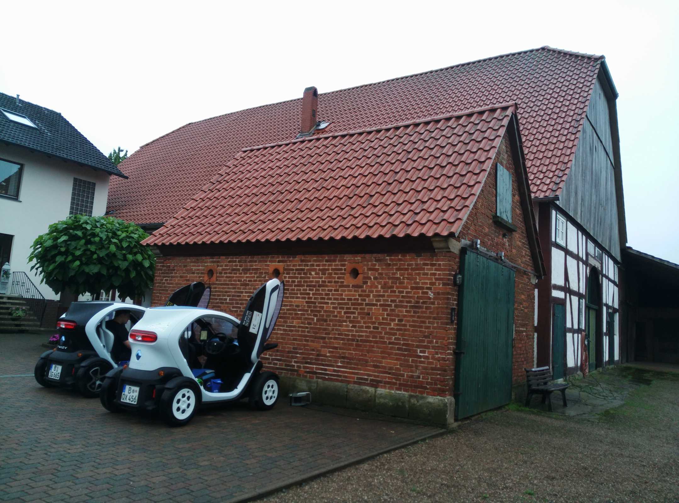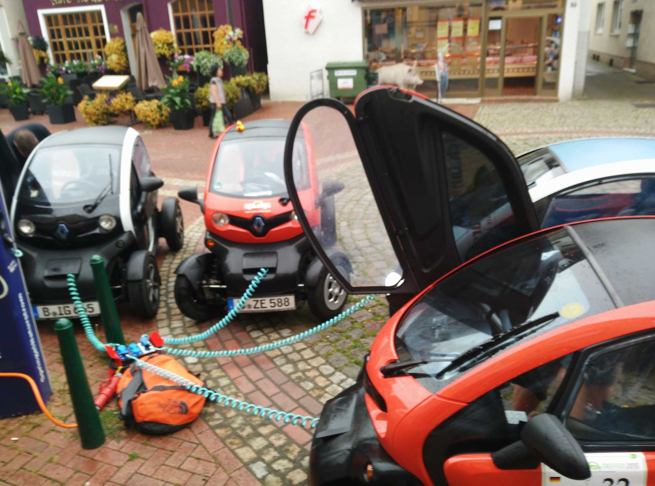 In Blomberg (nach knapp10km Umweg wegen gesperrter Straße) erster Ladehalt. Drei Twizys am Wohnmobilstellplatz aber nur zwei Campingadapter.