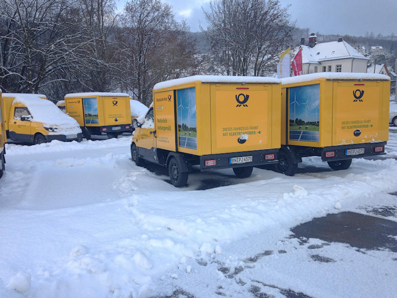 Sehe ich doch letzte Woche wie da 10 neue Elektro Paktetverteilwagen vom Trailer gezerrt werden.