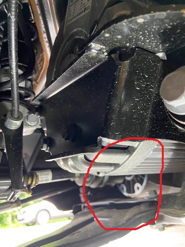 Motor mit Luftschlitzen ganz links Bremssattel hinten Handbremse Seilzug