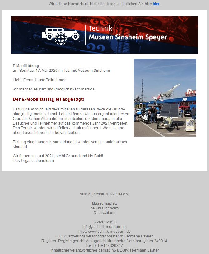 Aufgrund der aktuellen Corona Beschränkungen und der nicht absehbaren Entwicklung in den nächsten Wochen wird eine Veranstaltung mit zahlreichen Ausstellern, Teilnehmern und Besuchern am 16. Mai 2021 zusehends unrealistisch. Wir hatten mit dem Kraichgauer E-Mobilitätstag auf einen tollen Saisonstart im Technik Museum Sinsheim gehofft, werden die Veranstaltung am 16. Mai 2021 aber nun schweren Herzens auf einen späteren Zeitpunkt verschieben.