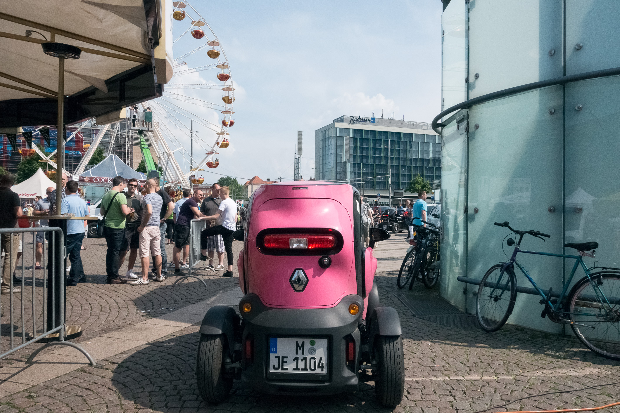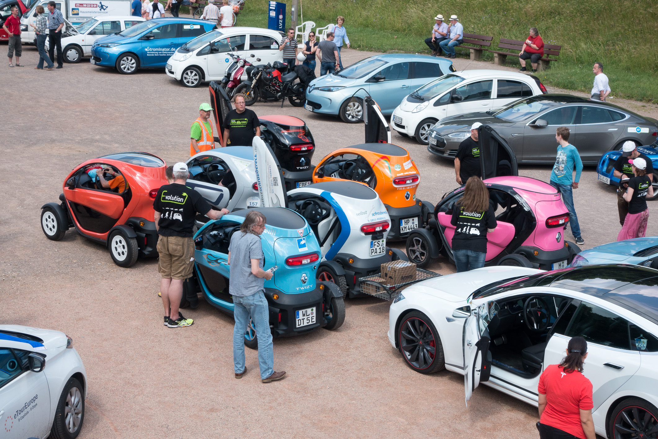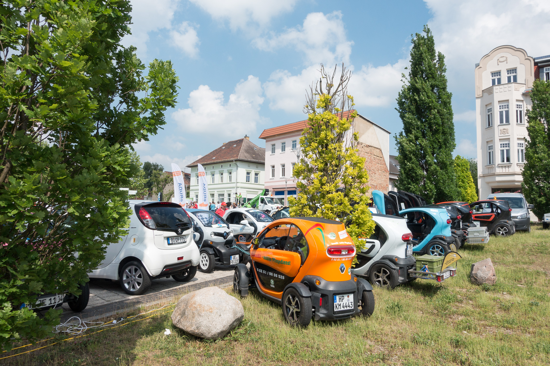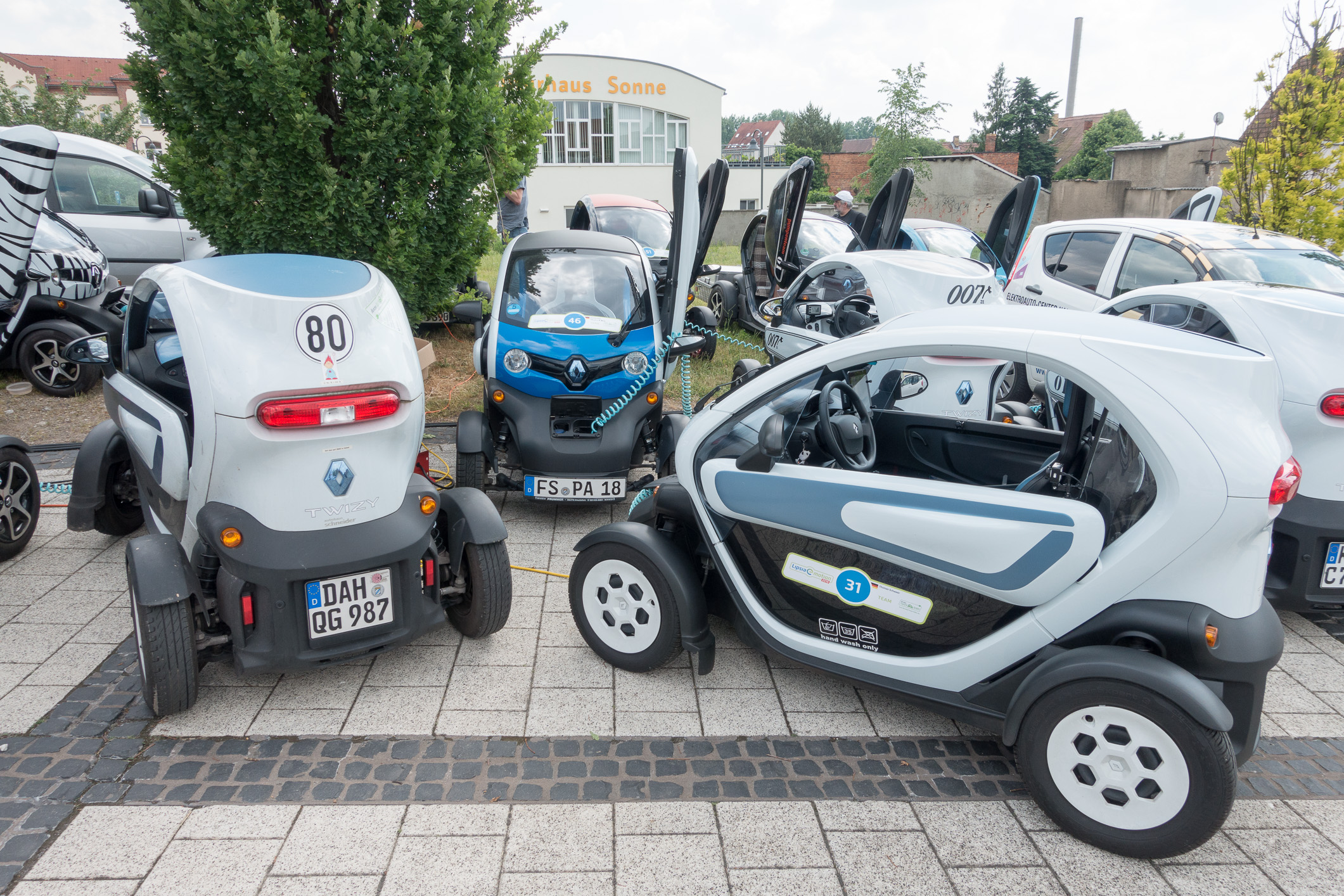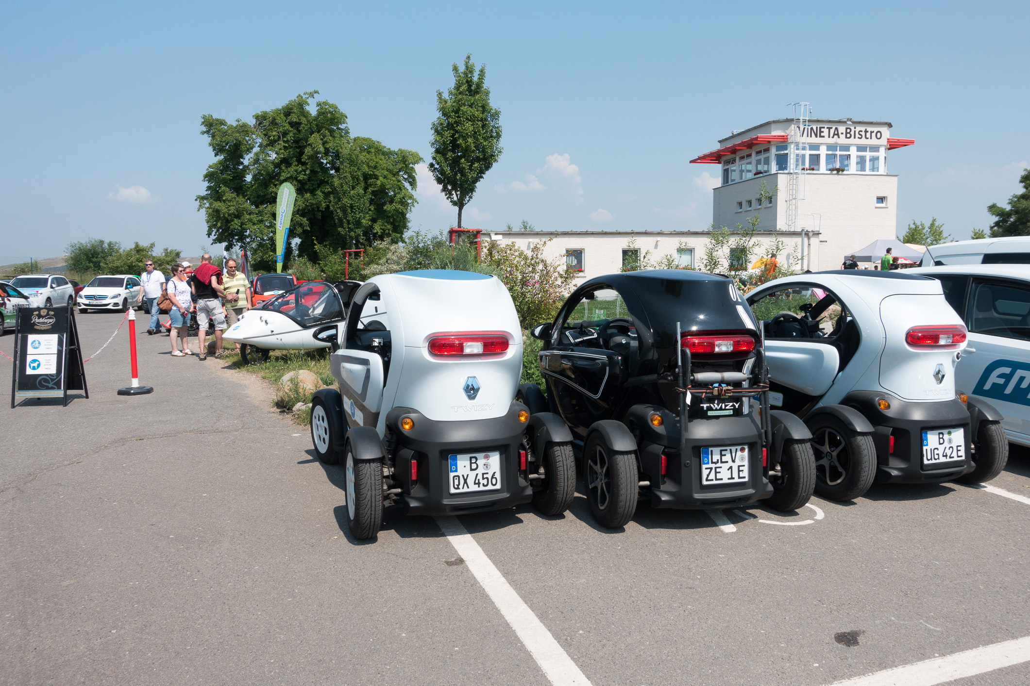 Drei ladeunwillige Twizys auf dem letzten freien Platz am Vineta-Bistro