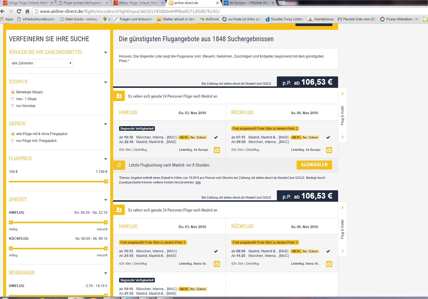 Hin-/mit Rückflüge ab MUC für ca. € 220,- (all inkl.) Flugzeit bis Madrid mit z.T. einem Stopp von 4-7 h / pro Pers.