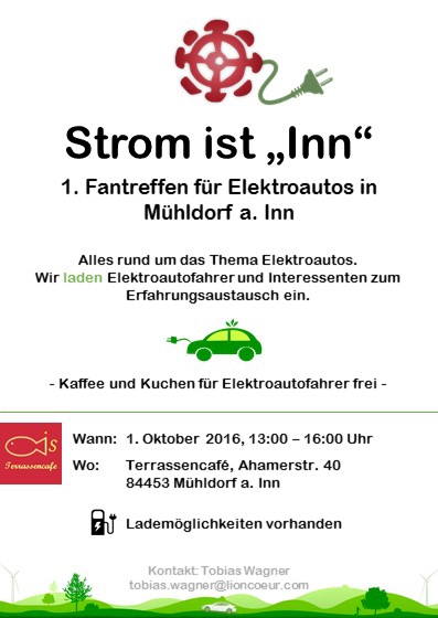Um die Elektromobilität erlebbar zu machen, veranstalten wir in Mühldorf a. Inn ein kleines Fantreffen für Elektroautos. Eingeladen sind sowohl Besitzer von EVs, als auch Interessierte am Thema Elektromobilität ohne eigenes Auto.