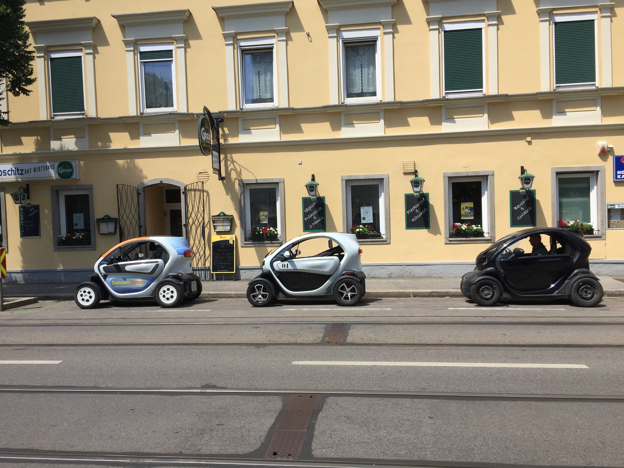 Auch wieder 3 Twizys vor dem Lokal:
