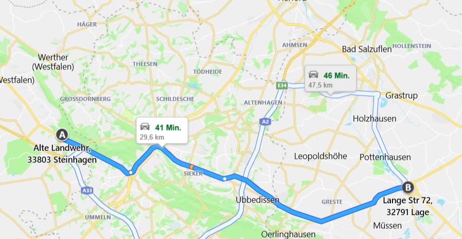 Bis Lage sind das 30km und von Detmold 46km...