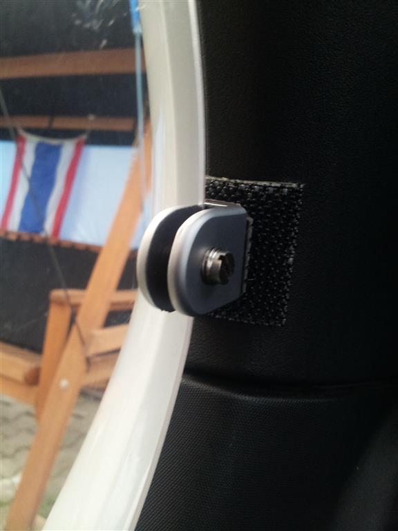 Vorgerichtete Glashalter an den vorgesehenen Stellen an der Karoserie (Rahmen) mittels Pilzkopf-Klettband befestigen. Zur Ausrichtung kann der Spalt zwischen den beiden Plastikteilen (Innen-außen) verwendet werden.