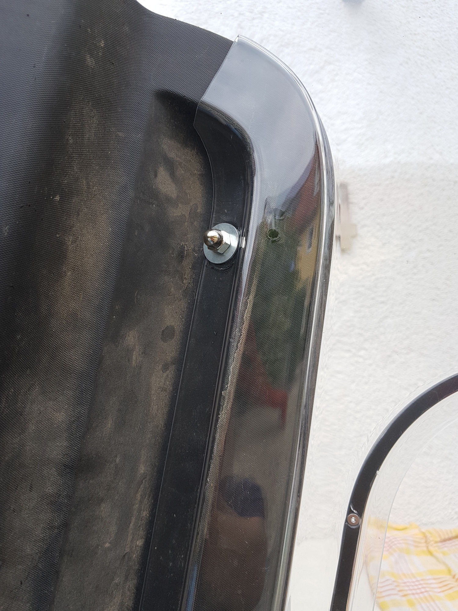 Also habe ich eine Idee: Die 3 Schrauben umgekehrt in die Muttern einschrauben. Diese mit einer flachen Gegenmutter fixieren, dann die Verkleidung wieder ran machen und dann guggen die 3 Schrauben ins Fahrzeuginnere rein. Dann die Fenster anbringen, wird leichter gehen. Dann diese mit einer Rändelmutter (besser keine Flügelmutter) befestigen, ggf. mit einer (Plastik)-Unterlegscheibe (A6) dazwischen. Um die Verletzungsgefahr vorzubeugen (Schraube schaut aus der Rändelmutter raus), kann man diese überstehende Schraube mit einer runden Hutmutter (kann aus Plastik sein) abdecken. Ggf. kann man zwischen Scheibe und Verkleidung noch eine Mutter (flach) mit Unterlegscheibe befestigen, dass die gar nicht mehr aus kann. Das werde ich nächste Woche oder in den nächsten Tagen ausprobieren.