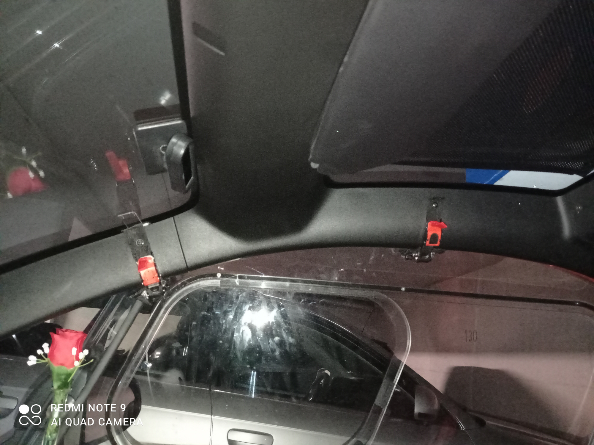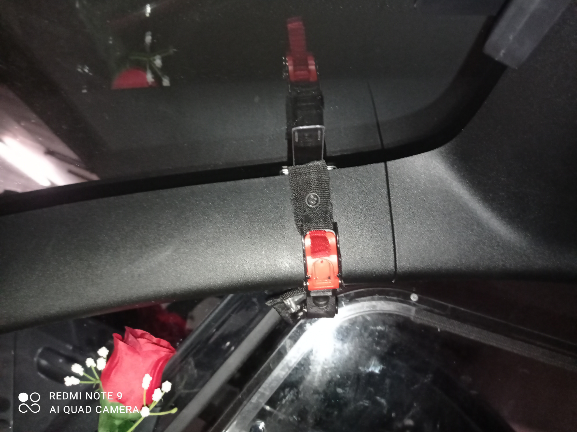 Aus Kolumbien gibt es für die Seitenscheiben sehr praktische Befestigungsclips aus Kunststoff. Im Original ist vorgesehen diese mit einem Klettband um den Dachholm herum zu installieren. Dazu müsste man die ganze Verkleidungen allerdings entfernen. Diese Mühe habe ich mir nicht gemacht, sondern einfach das Nylonband abgeschnitten und mit einem Feuerzeug zusammen geschmolzen.