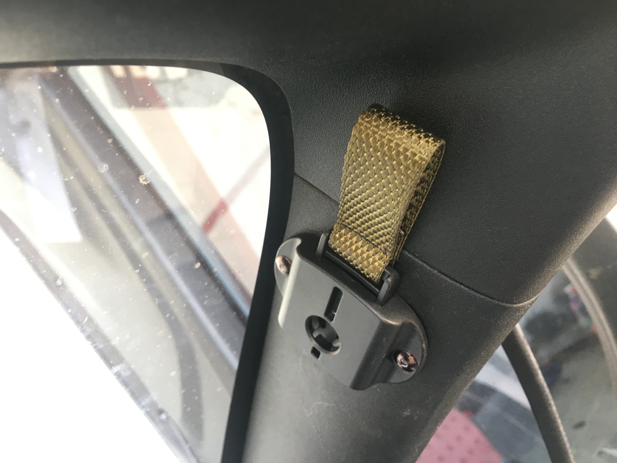 I would do the window straps in black, and choose a UV-Stable webbing. I could do Dyneema, but this material is very expensive, and like I said, overkill for the work the straps need to do.