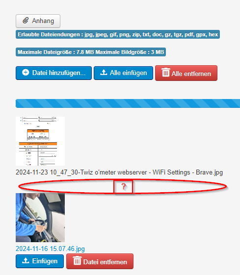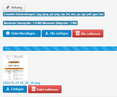 I'd like to write a post, with an inserted image. I can do the following: Anhang -> Datei hinzufügen -> select the image. A small thumbnail of the image then appears under the field where I'm writing the post. That part is succesful. But I cannot figure out anymore how to actually insert the image into the post. The button Alle einfügen does nothing, the button Alle entfernen removes any thumbnail that are present under the post field.