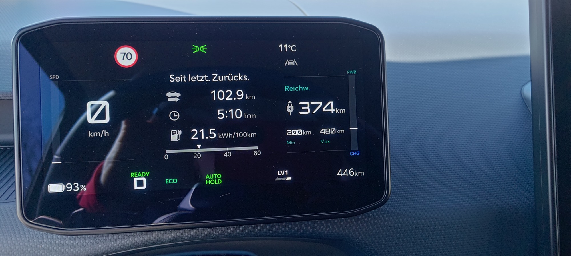 Auch ganz gut ist die Reichweitenanzeige. Der niedrigste Wert ist das Minimum, also Vollstrom und gib ihm, der mittlere Wert ist die Reichweite beim Momentanverbrauch, der höchste Wert die max. Reichweite, wenn man es gemütlich angehen lässt. Lasst euch vom Durchschnittsverbrauch nicht blenden. Ich bin das Fahrzeug noch keine 50 km gefahren und in diesen eher spritzig, macht es schon ordentlich Spaß, wenn der Kasten nach vorne marschiert.