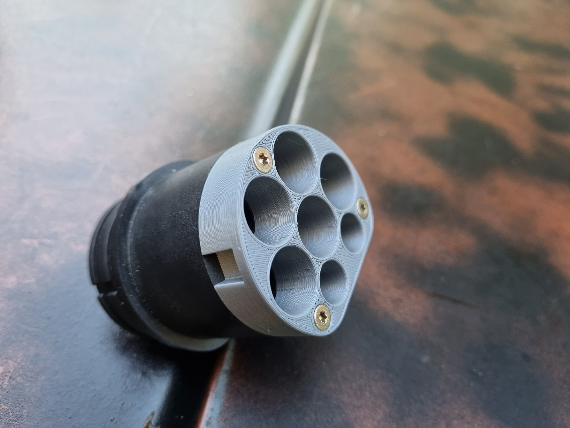 Um einen solchen Typ2-auf-Schuko Ladeadapter an Ladesaeulen mit festem Kabel verwenden zu koennen, muss man nur den Typ2 Stecker um 12mm kuerzen. Das geht mit einer feinen Buegelsaege und es geht sogar ohne dass man die Kontakte vorher ausbauen muss. Das durch das Absaegen zu kurz gewordene Vorderteil mit den Ausnehmungen fuer die Verriegelung hab ich ersetzt durch ein mit dem 3D-Drucker in der korrekten Laenge nachgedrucktes Teil. Da sind jetzt zusaetzlich drei Loecher drinnen, durch die man diese "Verlaengerung" wieder an den Typ2-Stecker anschrauben kann, wenn man an normalen Dosen anstecken moechte.