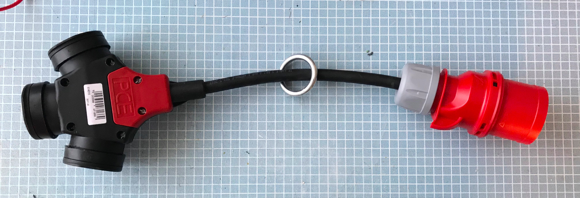 Um an 32 A CEE rot laden zu können, habe ich mir einen Adapter auf 2x Schuko mit Feinsicherungen zum Leitungsschutz gebaut.