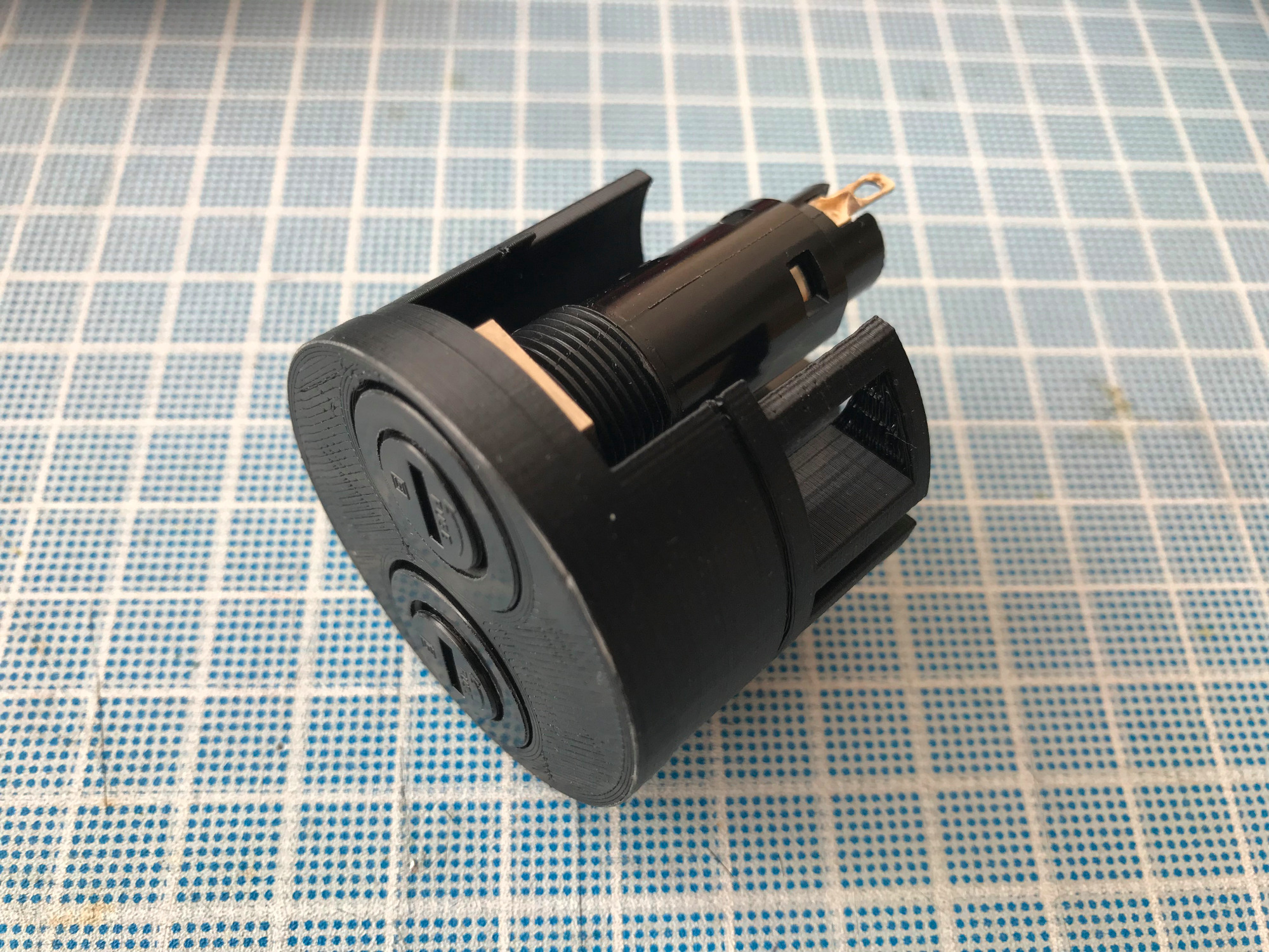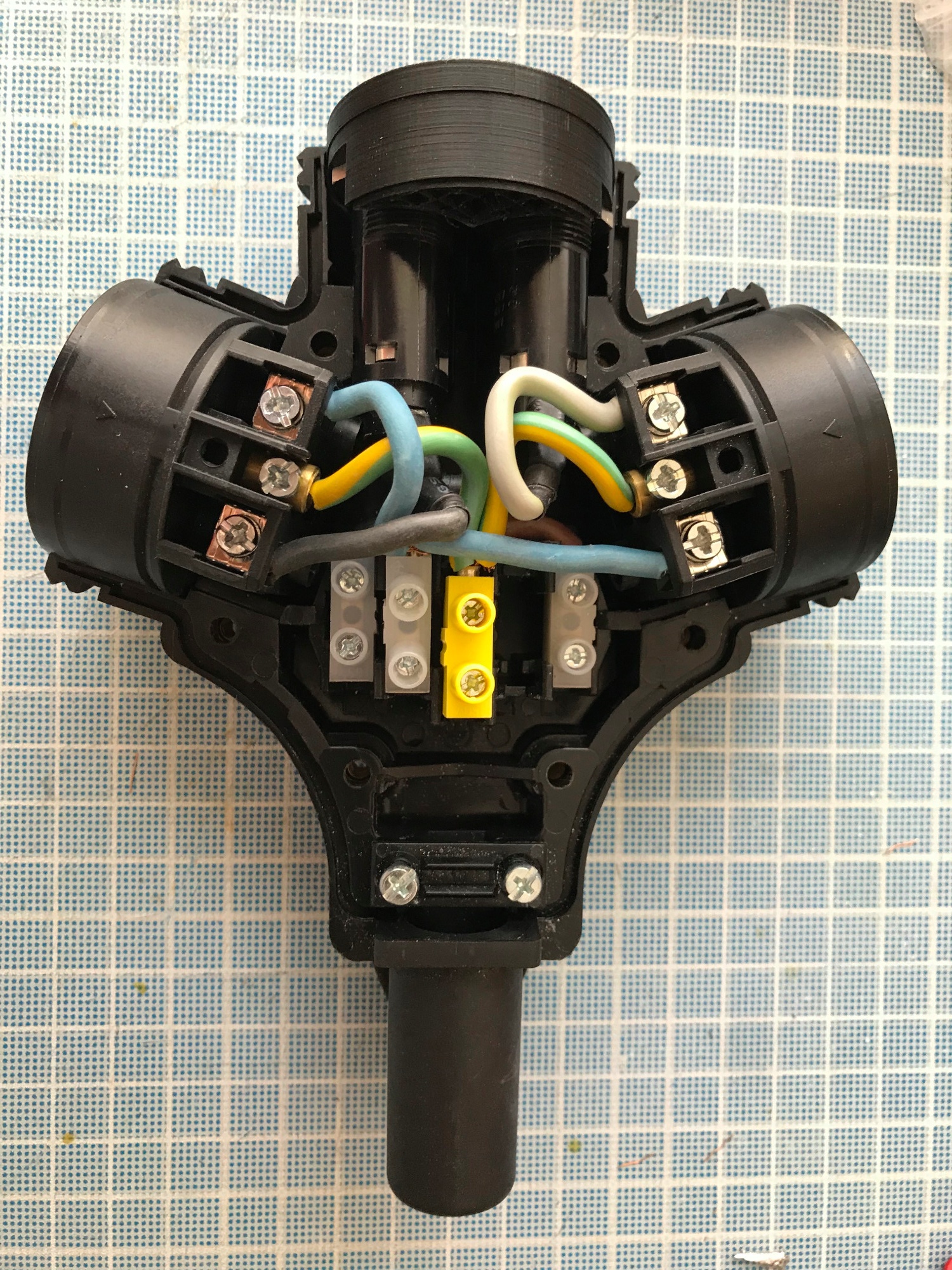 In das 3D-gedruckte Formteil werden die beiden Sicherungshalter eingelegt und festgeschraubt und das Teil nach Verkabelung in die mittlere Schuko-Aufnahme eingelegt. Das ganze ist ein wenig frickelig.