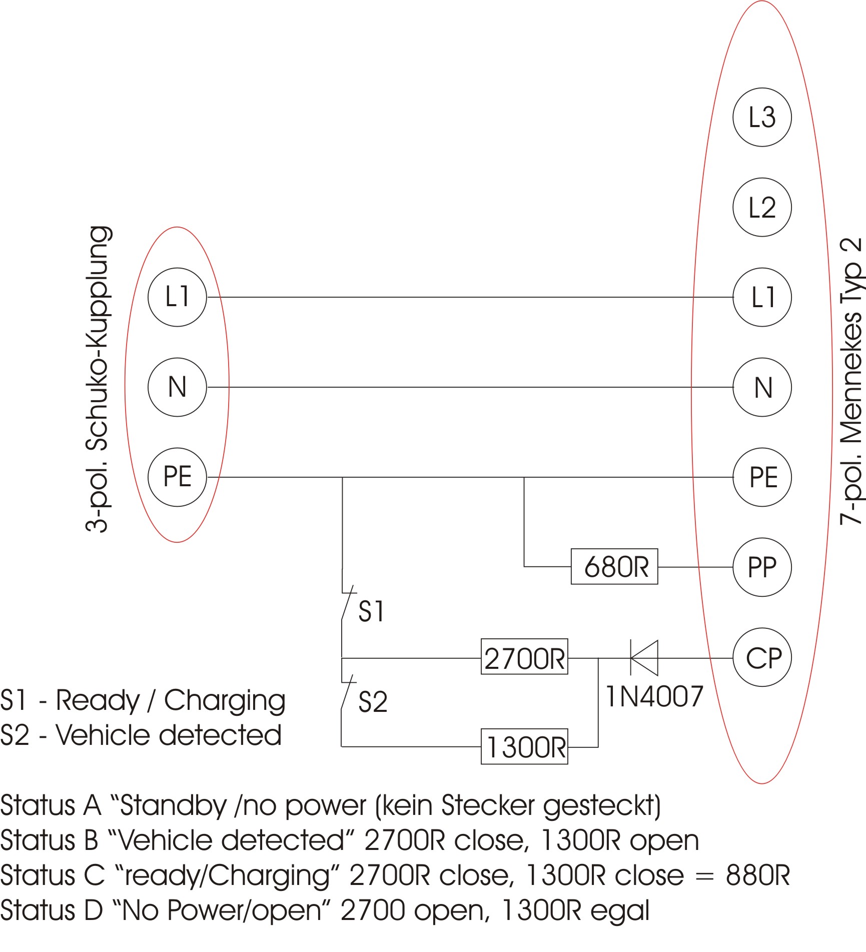 Nachdem ich mir einen Twizy zugelegte habe ich mir nun auch einen Adapter von Typ2 Stecker auf Schuko gebaut. Mit zwei Schaltern, Diode und den Widerständen. Kann über den einen Schlüsselschalter getrennt werden also offen oder über den anderen Schalter von 880ohm auf 2700ohm geschaltet werden also alles so wie es sein soll. Hab auch auf die Diodenrichtungen geachtet. Dennoch kann ich an den wsw Säulen in Wuppertal keine Kommunikation aufbauen. Dee cp pin ist selbstverständlich original also kürzer als der pp pin. Hat einer eine Idee für soo eine schwierige Ferndiagnose oder kommt jemand aus Wuppertal oder Umgebung wo ich mir 3inen funktionierenden Adapter mal ansehen kann? Langsam bin ich verzweifelt