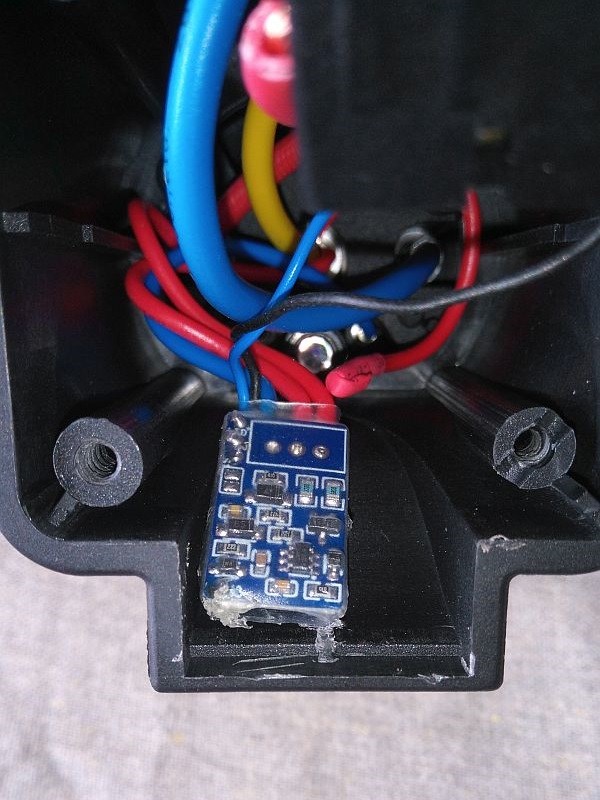 Rechts unten kann man erkennen, dass die Halterung für die Schraube etwas verkürzt ist und eine Nut hat. Bei diesen Adaptern war an der Stelle eine LED eingesetzt, bei meinem Adapter habe ich hier die LED aus dem Platinen-Bausatz plaziert.