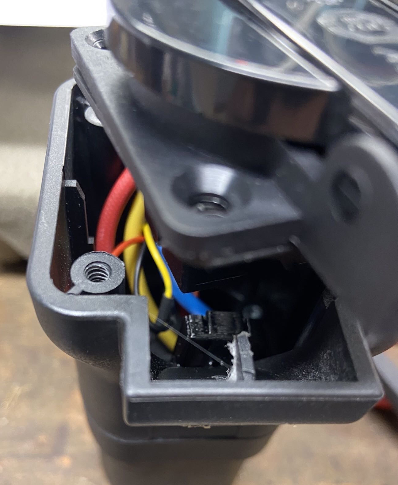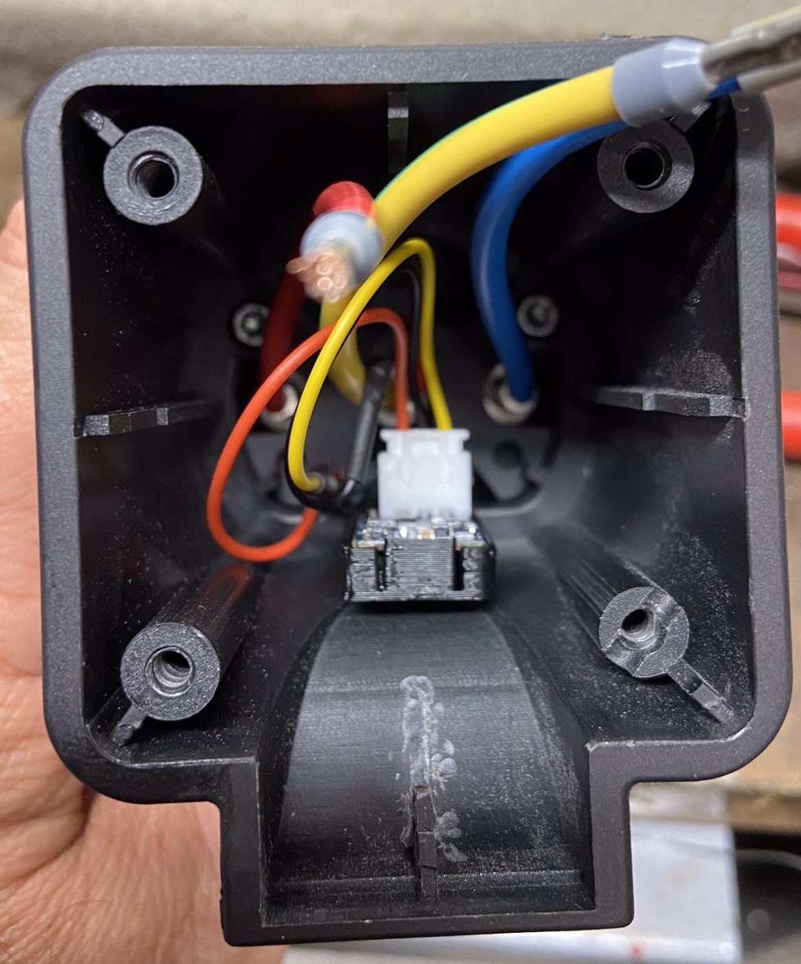 Die Signaldiode der CCP Platine ist jetzt von oben zu sehen dazu ein Loch mit 3mm gebohrt das fixiert auch die Platine. Dort muss zum Stoppen des Ladens auch der Magnet vorgehalten werden. Was dann zum entriegeln (Freigeben) des Adapters führt.