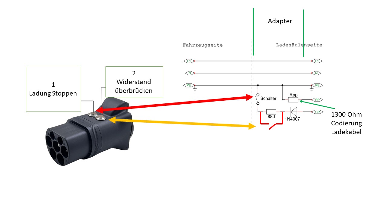 4. Die beiden Schalter am fraglichen Adapter haben nicht die Funktion der 2 Schalter an normalen Adaptern. Vielmehr schaltet der rechte Schalter (Bertholds Schaubild Schalter 1) 880 Ohm auf CP. Das entspricht "ready for Charging" und ich würde daher erwarten, dass der recht Taster gedrückt sein muss, damit geladen werden kann. Der linke Schalter überbrückt hingegen die 880 Ohm. An Ladesäulen dürfte das das sofortige Ende des Ladevorgangs bedeuten, da KEIN Widerstand an CP keine "Ready to Charge signalisiert. Der darf also nicht geschlossen sein zum Laden. Es ist aber denkbar das beide Schalter gedrückt sein müssen, falls nämlich der linke Schalter ein Öffner ist und kein Schliesser (ich hab den Adapter da und werde das gerne morgen mal ausmessen)