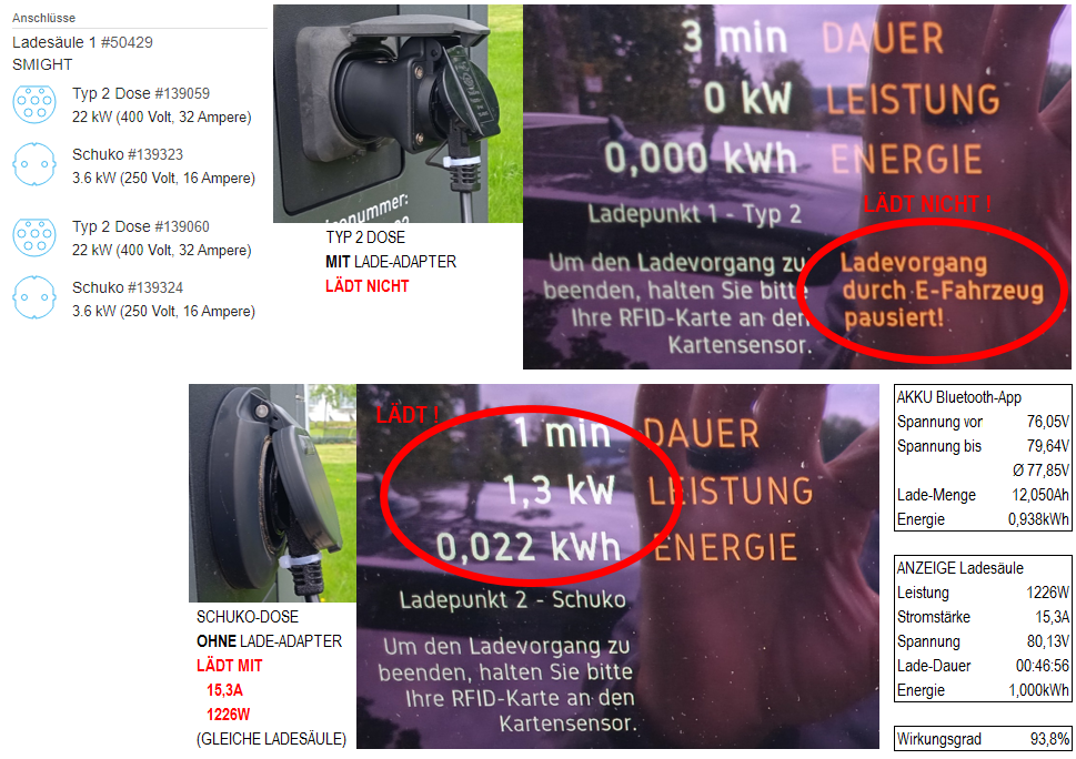 Zweiter und dritter Ladeversuch an Ladesäule mit sowohl Typ2-Dose als auch Schuko-Dose: