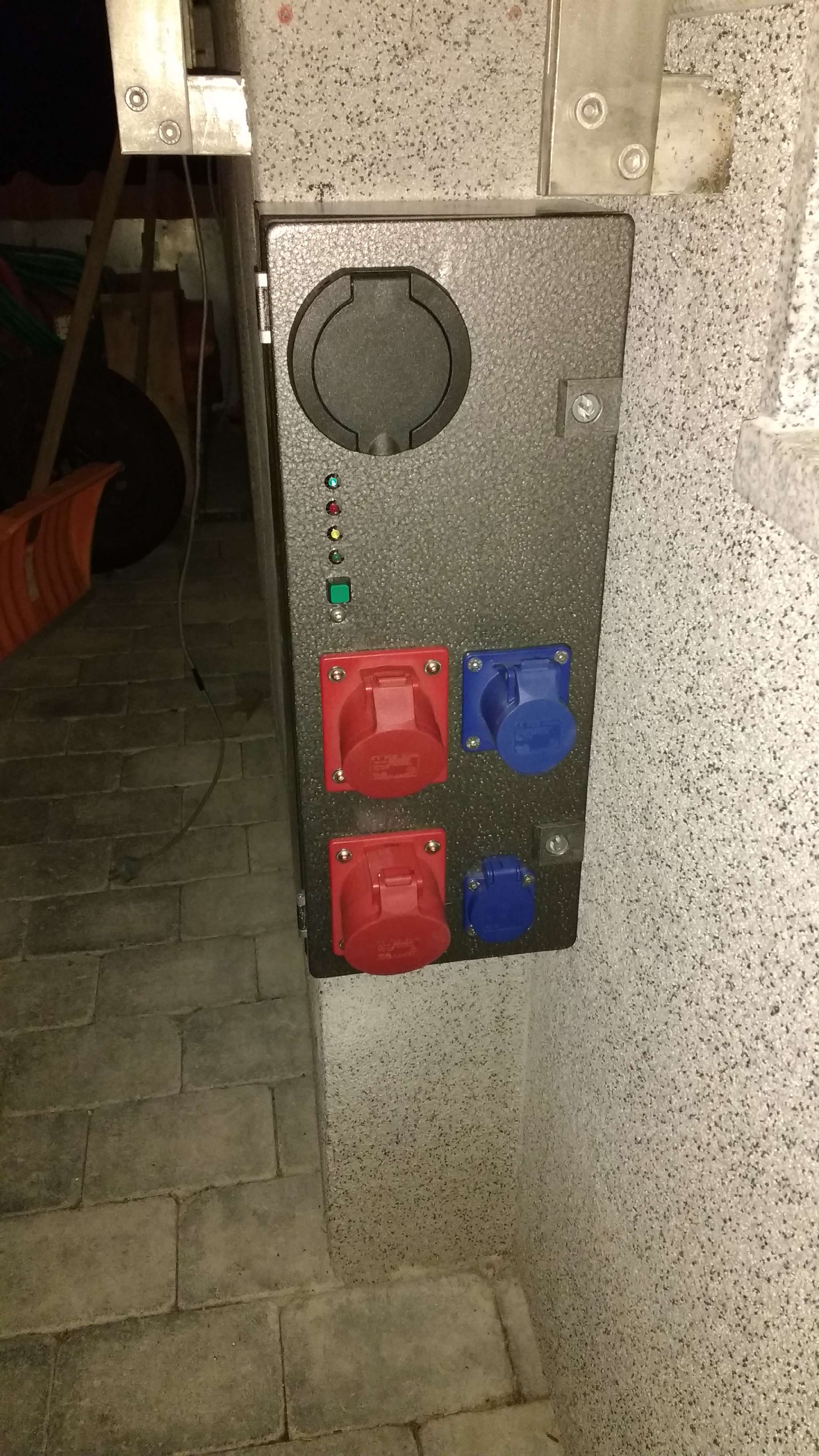 Da ich neben dem T demnächst auch irgend ein anderes Fahrzeug zusätzlich an Typ2 laden will musste eine "richtige" Ladestation her. An der Stelle neben der Treppe passt gerade so ein Rittal hin, und von da aus ists auch nur 3m weit zur Verteilung.