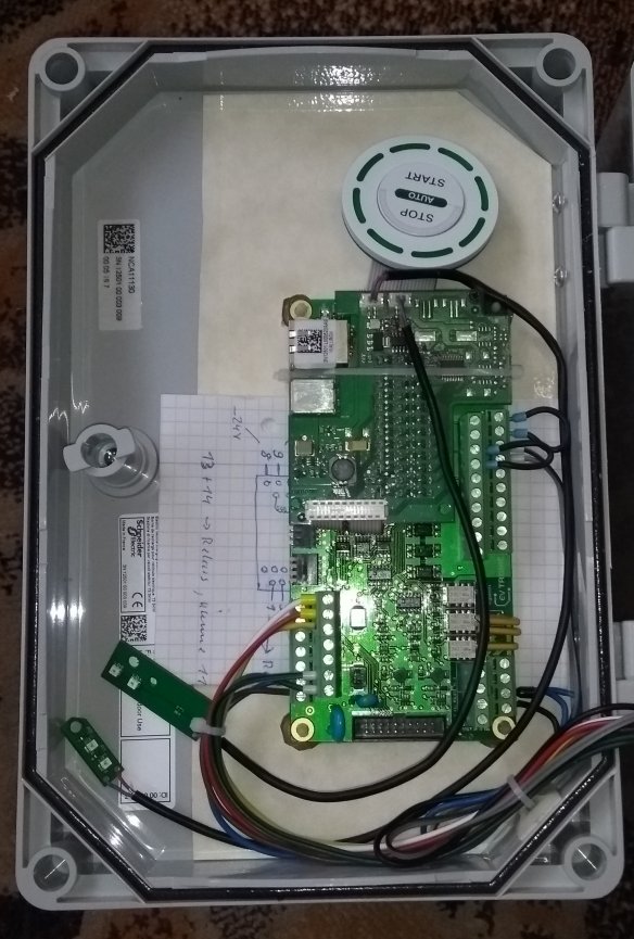 Eine Brücke auf J32, 2.v.R. und die zwei #13 + #14 gehen auf eines der beiden 24V Relais, direkt neben dem Hauptschaltschütz, dessen Öffner dann an Drähte 11 und 12 neben dem Hauptklemmbock anliegen