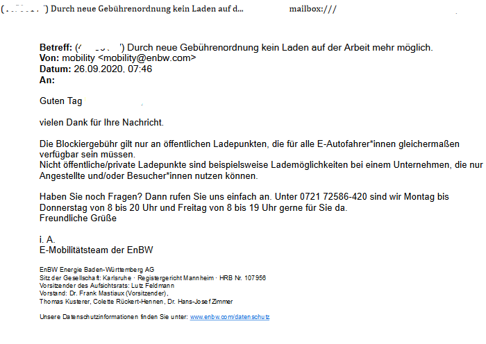 EnBW hat mir nochmal per Mail bestätigt, dass die Strafgebühr an "nichtöffentlichen" Ladestellen tatsächlich nicht berechnet wird.